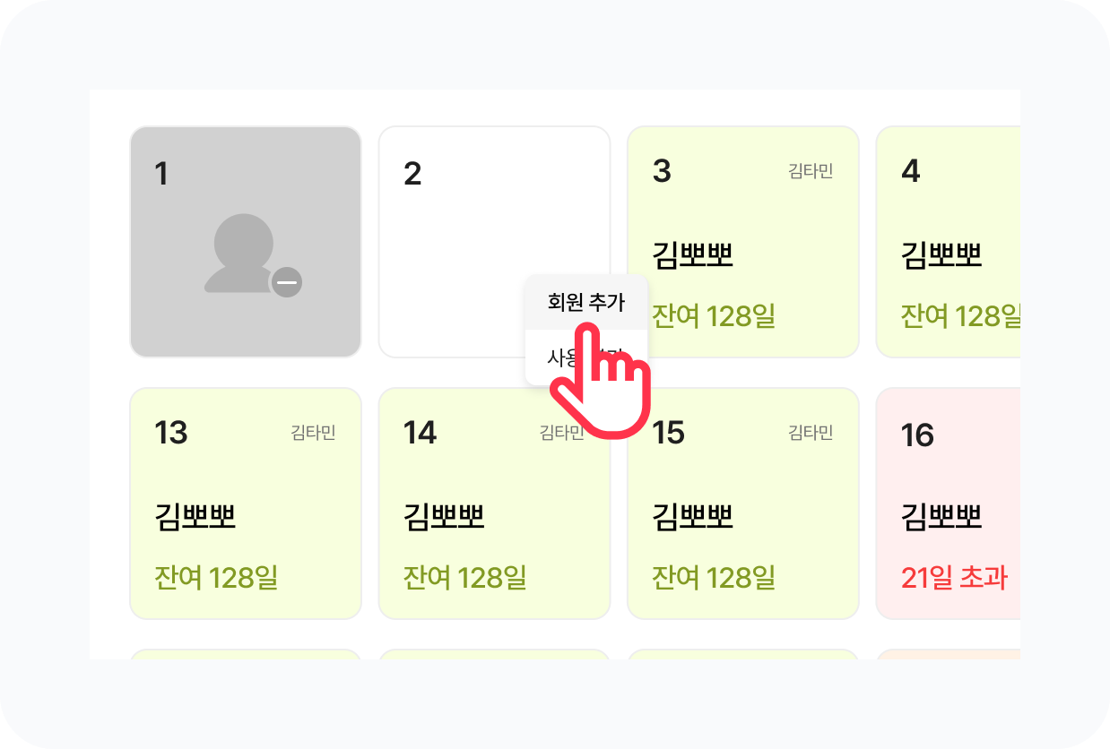 락커에 등록된 회원 이름 / 이용기간 / 메모를 확인 할 수 있어요.