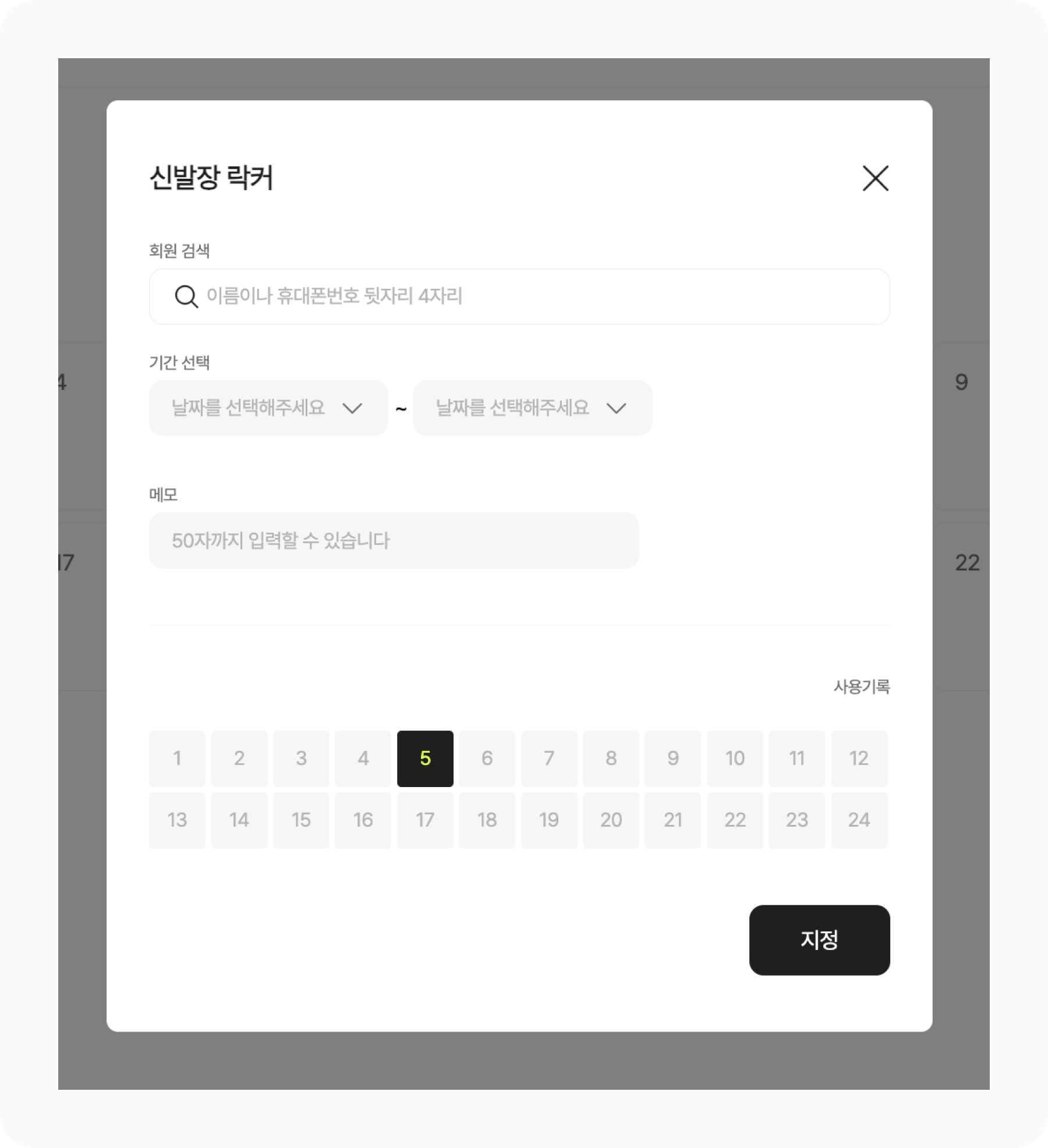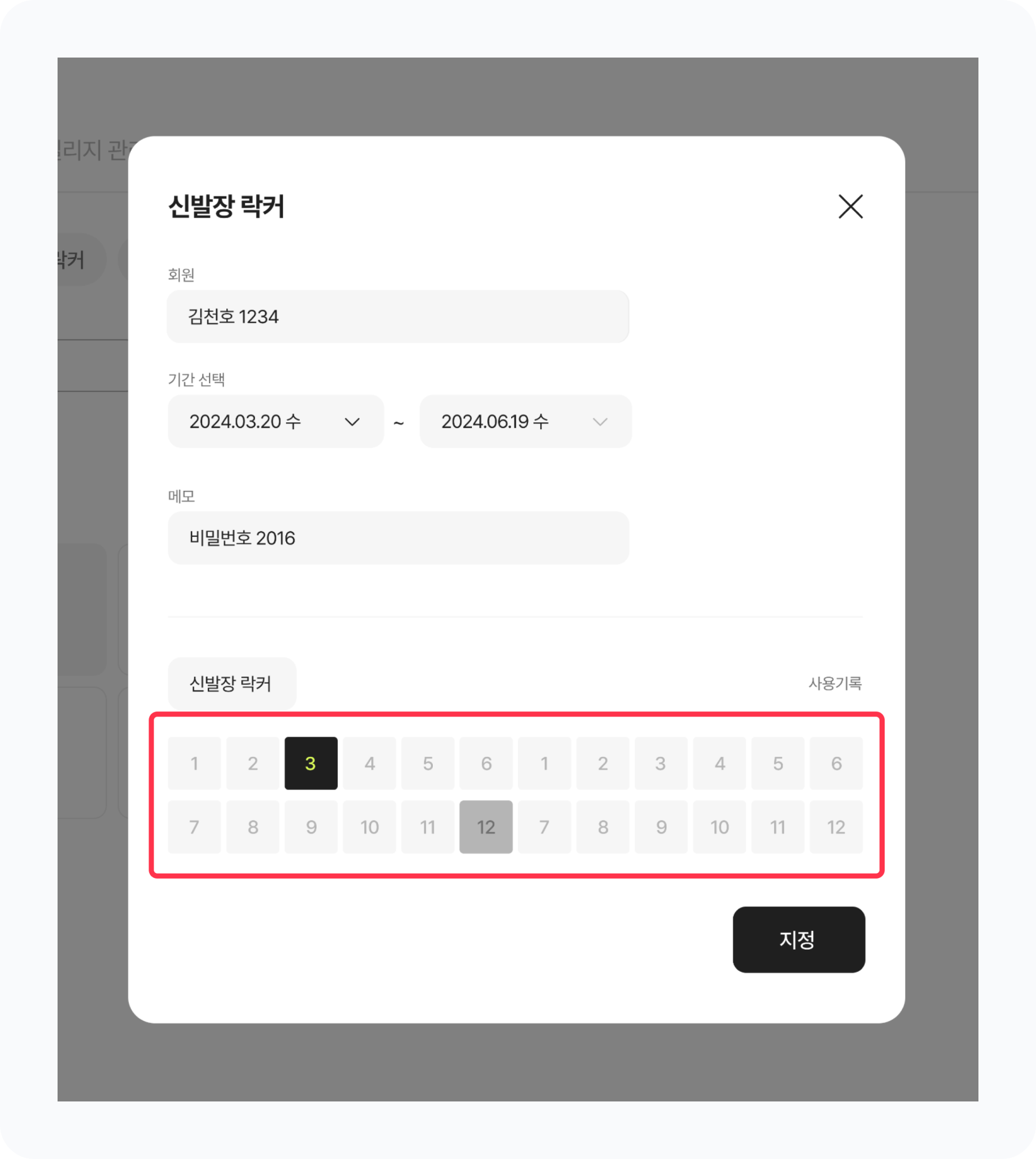 이용 회원과 이용 기간, 메모를 입력한 후 지정 버튼을 클릭하여 손쉽게 락커를 배정할 수 있어요.