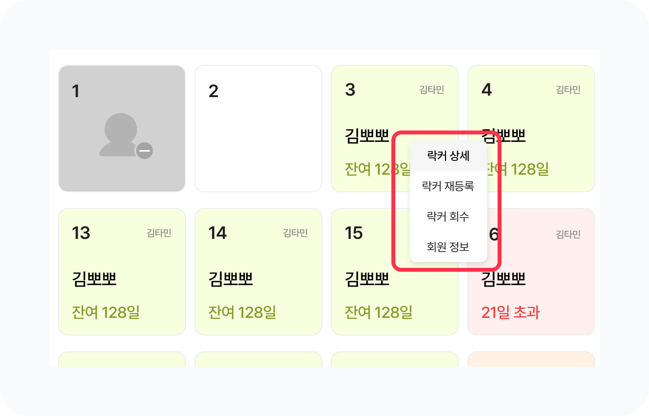 락커 대여 이용권이 만료 되어도 락커는 자동으로 회수되지 않습니다. 다른 회원에게 락커를 배정하기 위해 이용권이 만료된 회원의 락커는 꼭 회수해주세요.