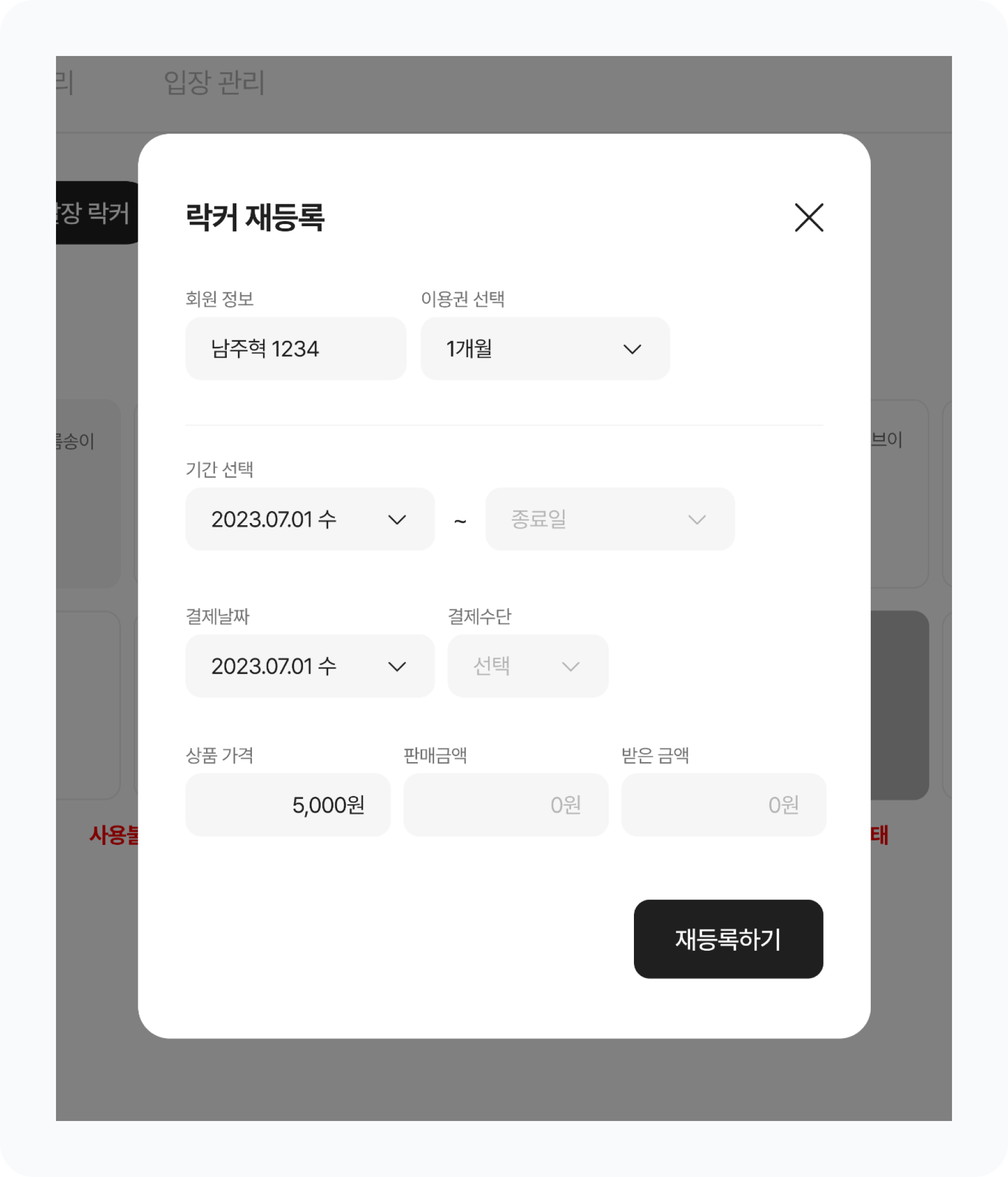락커 재등록 옵션을 선택하면 [락커 재등록] 팝업창이 표시돼요.
