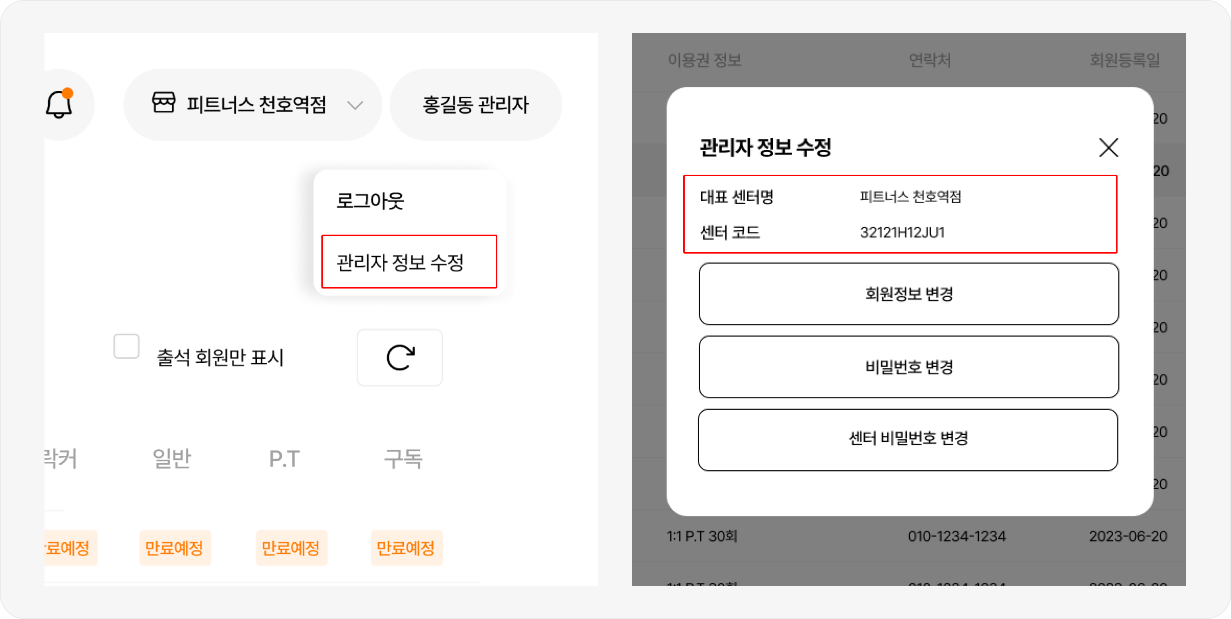 관리자 이름>관리자 정보 수정버튼을 클릭하면[관리자 정보 수정] 팝업에서 대표 센터명과 센터 코드를 확인할 수 있습니다.