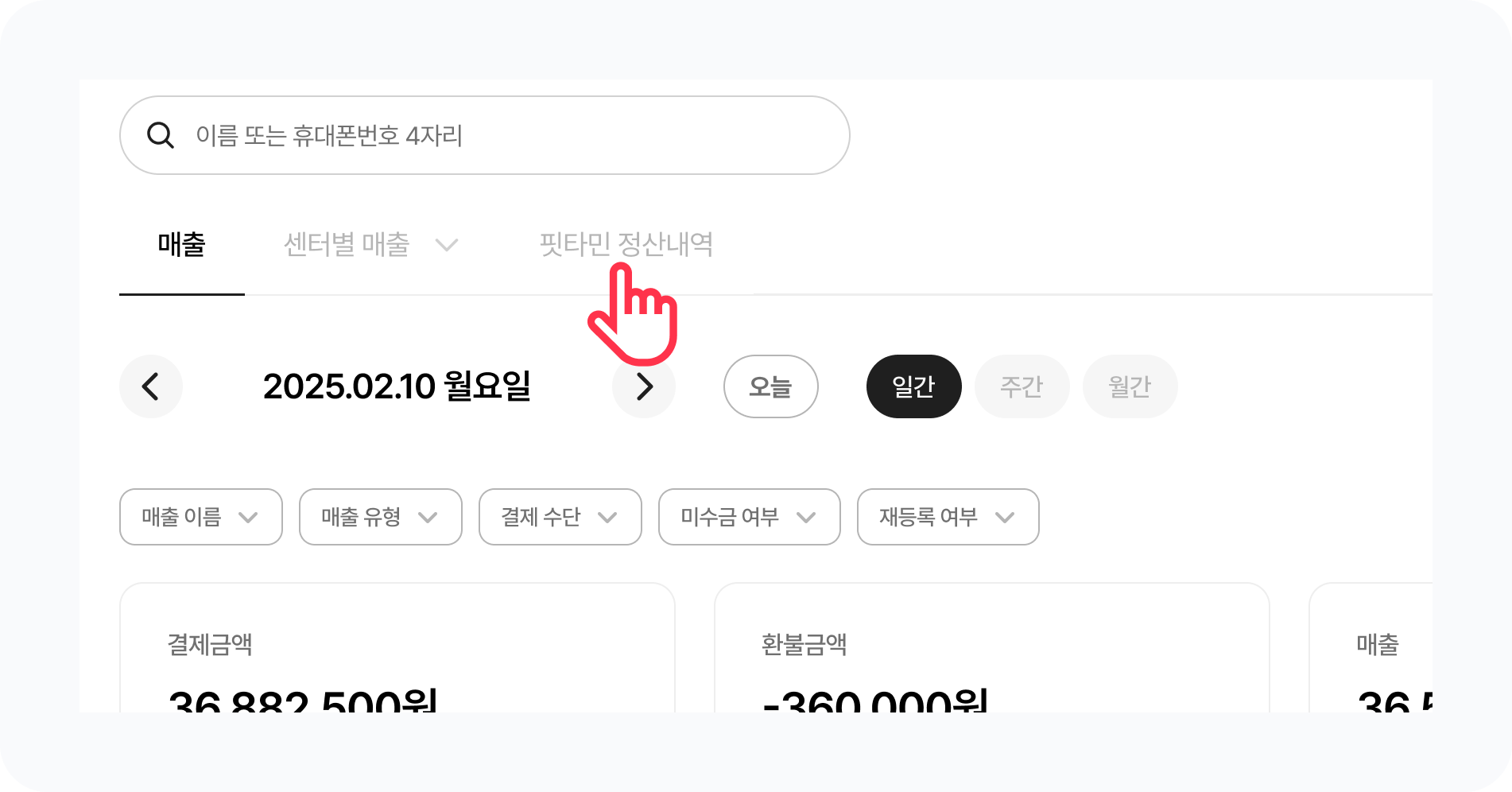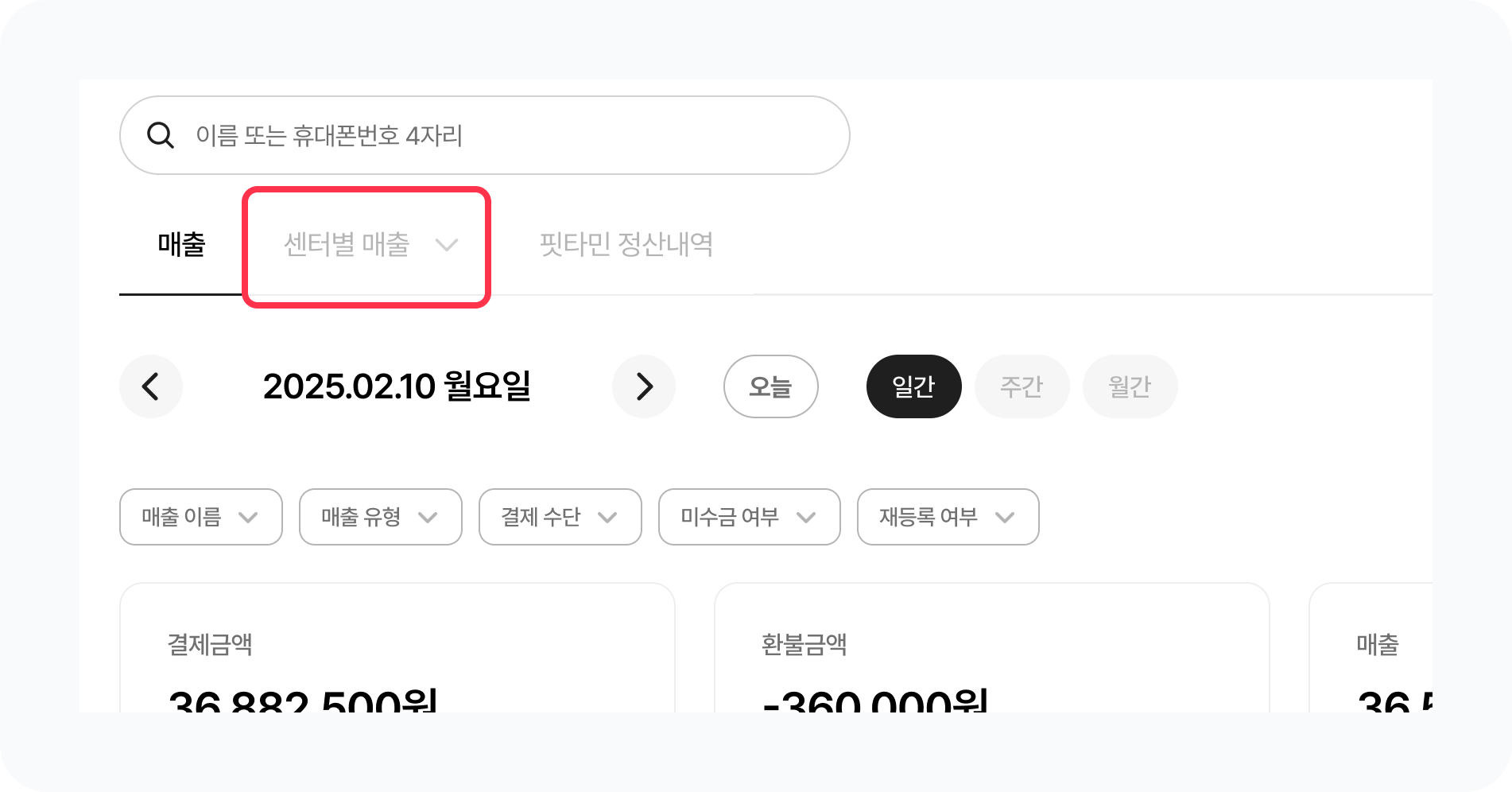 센터별 정산내역 탭에서 편리하게 종속센터를 선택해 매출을 확인할 수 있어요.