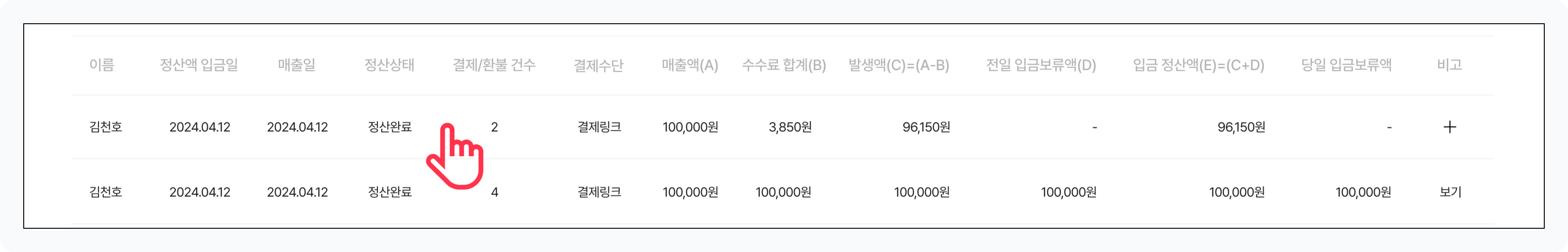 입금 정산액(E)=(C+D) : 당일 발생액과 전일 입금 보류액을 합산하여 표시합니다.