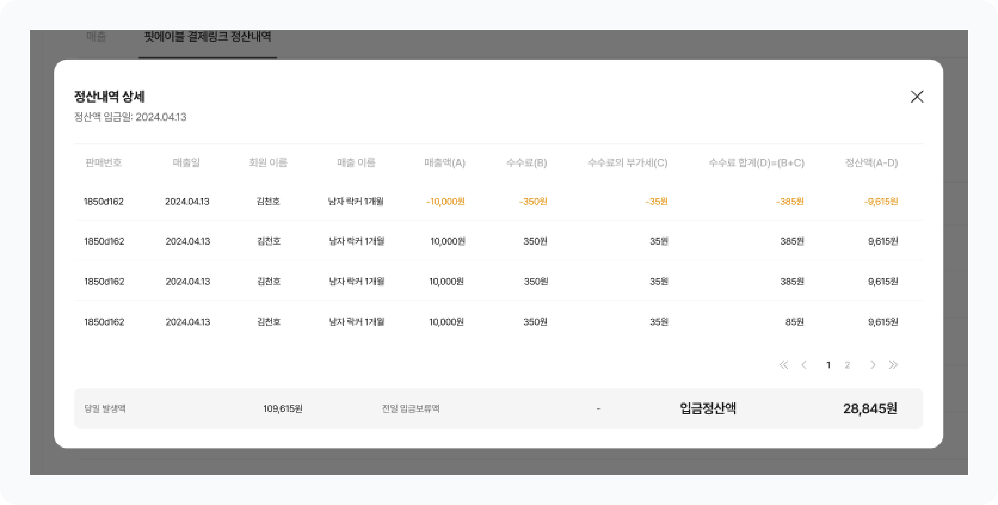 목록에서 정산 내역을 클릭하면 [정산내역 상세] 팝업이 노출됩니다.