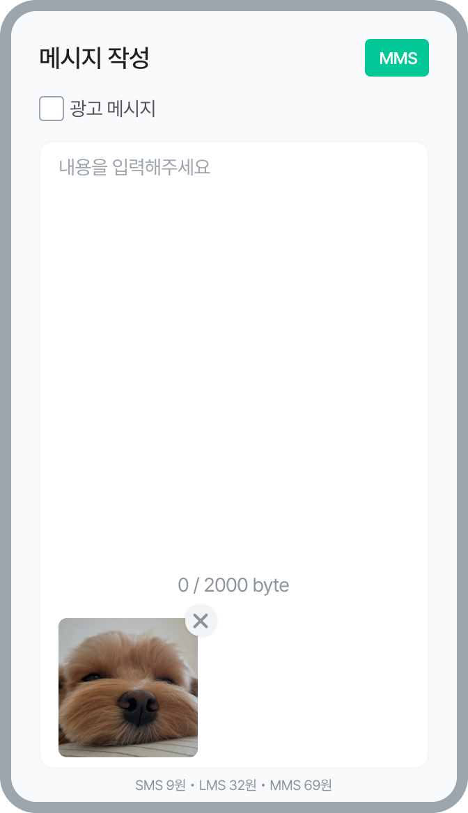 메시지를 작성하면 길이에 따라 SMS/LMS로 설정되고, 사진을 첨부하는 경우 MMS로 변경돼요.