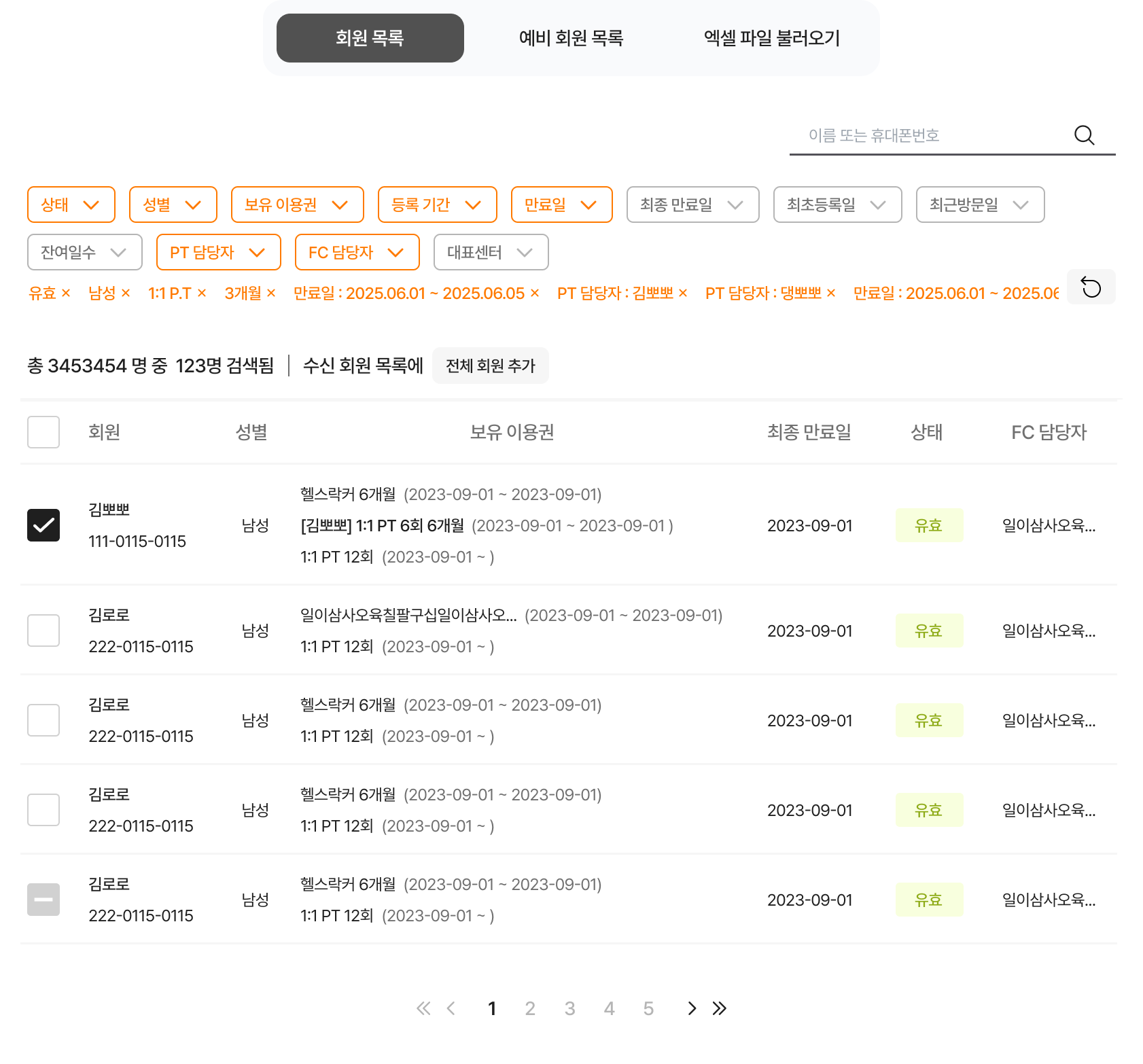 회원 목록에서는 [회원앱 > 마케팅 수신 동의]항목에 동의한 회원들만 수신회원으로 추가할 수 있어요. 여러 필터링을 활용하여 마케팅이 필요한 회원에게 문자를 전송할 수 있어요.