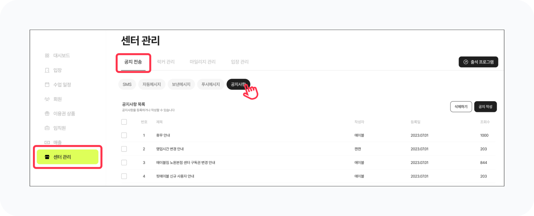 [센터관리] 메뉴에서 공지전송탭을 선택한 후 공지사항을 클릭해주세요.