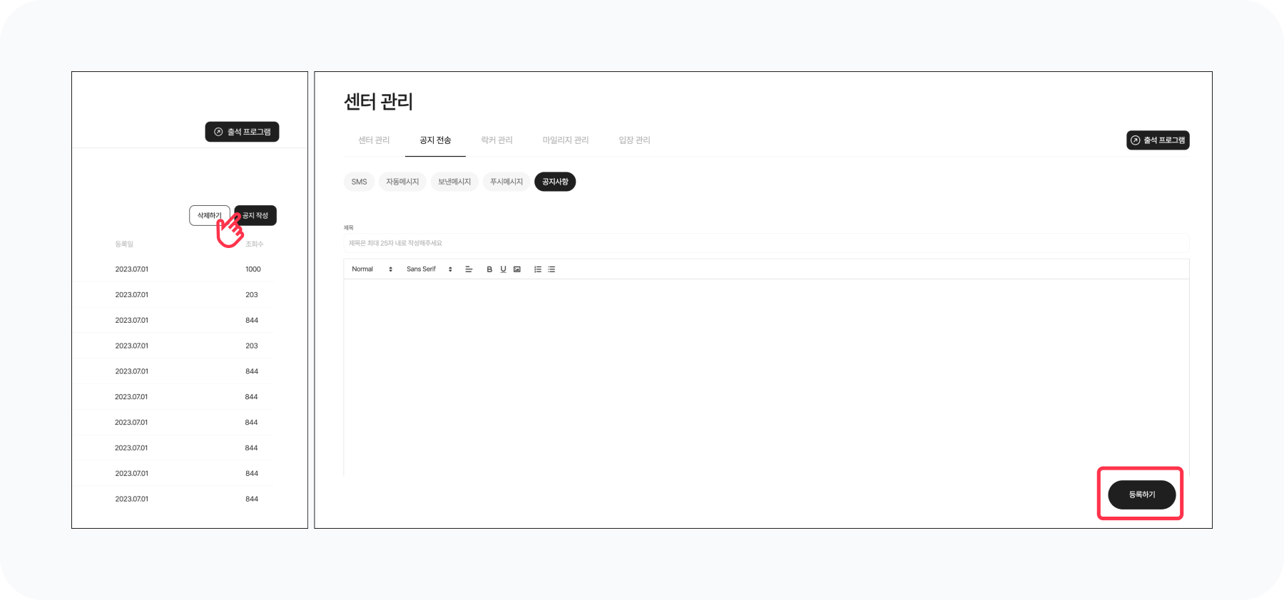 등록하기버튼을 눌러 공지사항 등록을 완료해주세요.새로운 공지가 등록되면 [회원앱]에서 알림으로 알려드려요.