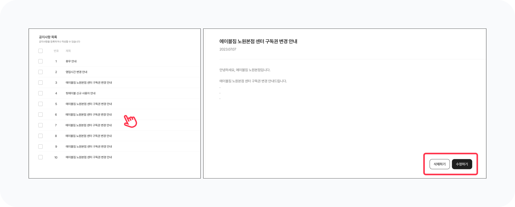 공지사항을 선택하면 [공지사항 상세] 페이지로 이동합니다. 선택한 공지를 수정 또는 삭제할 수 있어요.