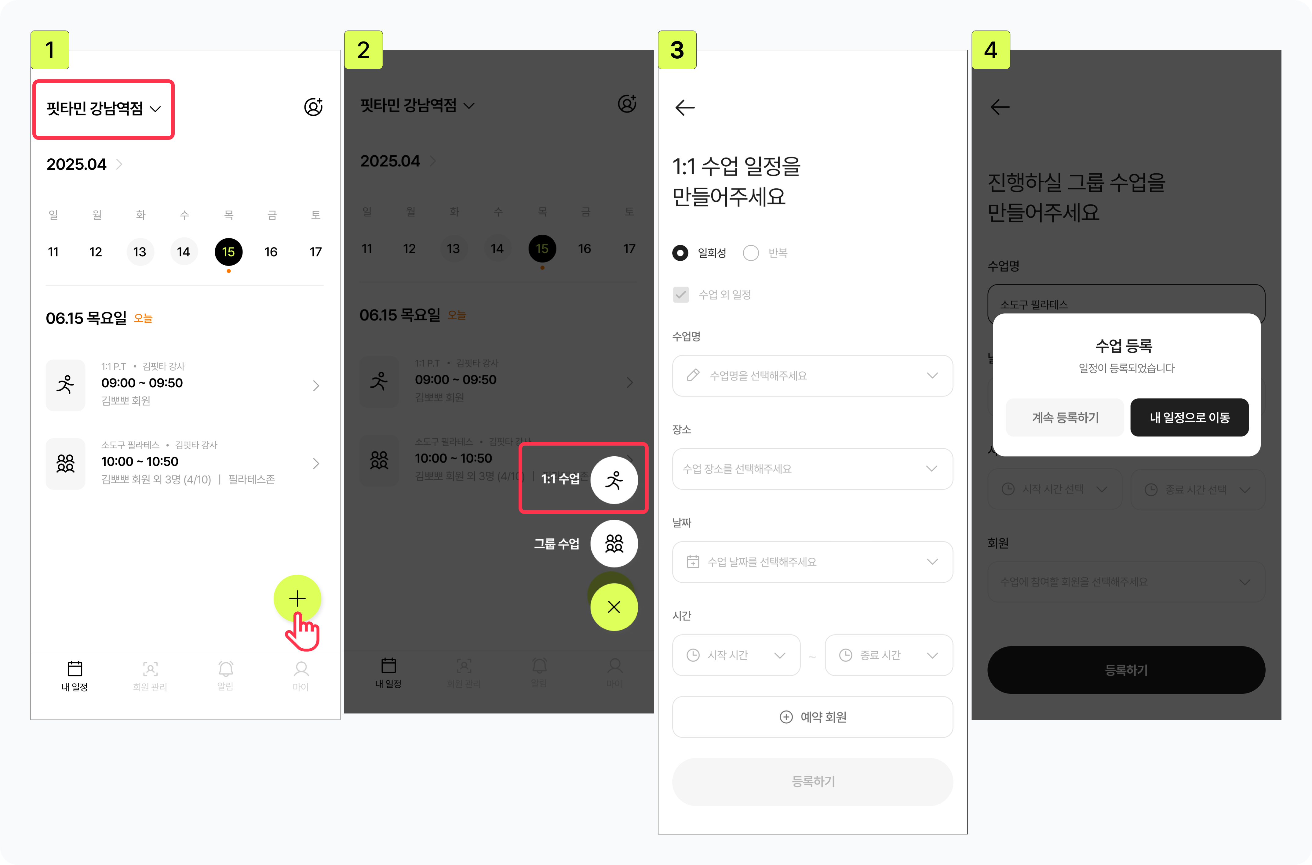 그룹 수업은 수업 일정 등록 후 [내 일정 > 수업 일정 상세] 페이지에서 예약 회원을 등록할 수 있습니다.