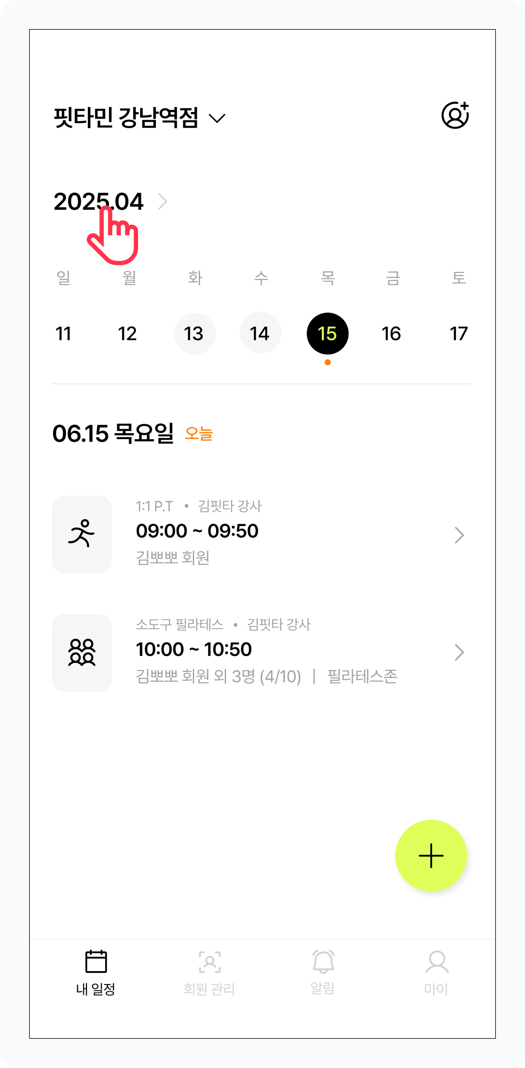 [내 일정]에서 예약 회원을 추가 할 수업을 선택해주세요.