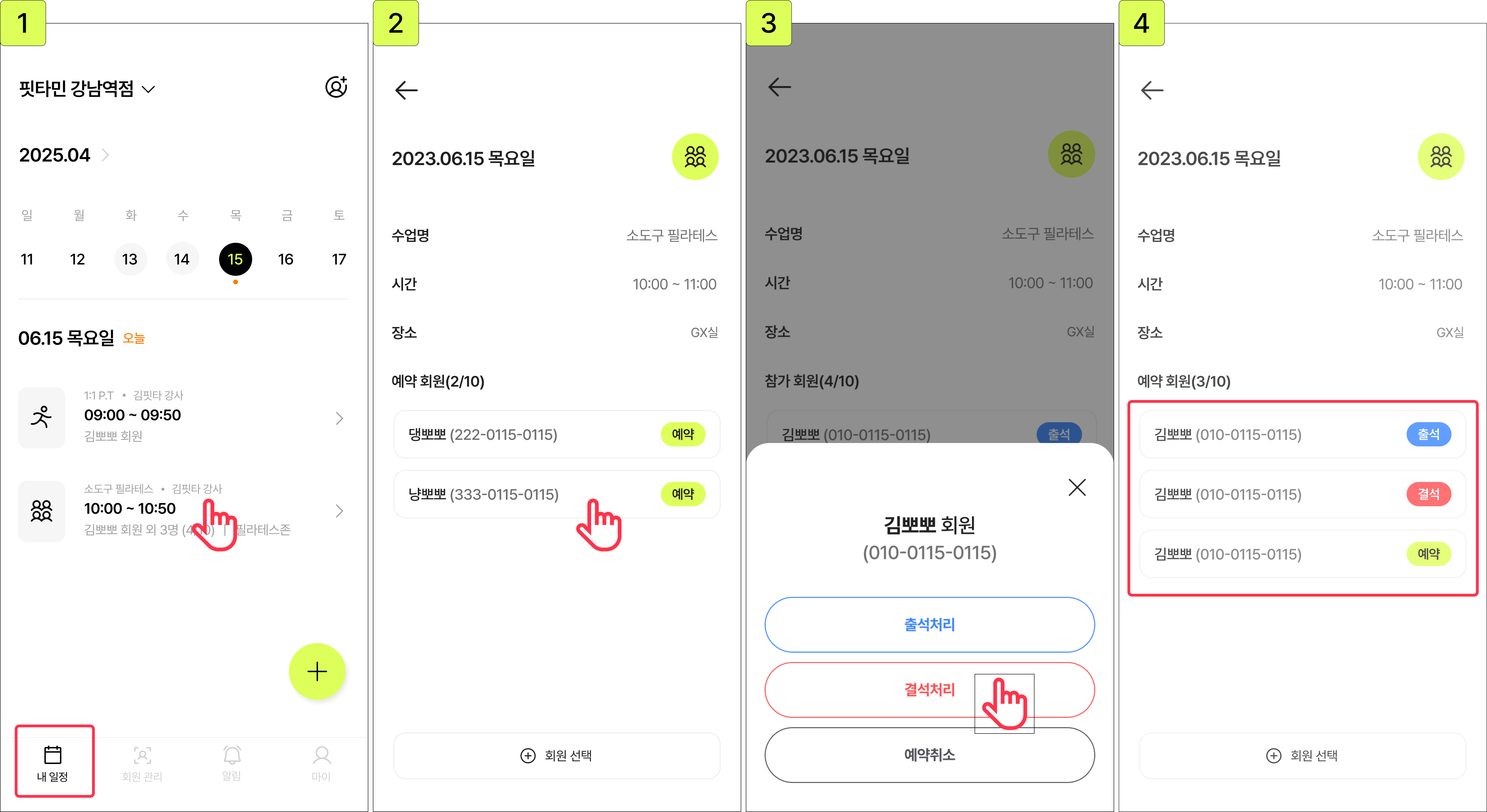 예약 회원 목록에서 회원을 선택해 예약 취소 또는 출결 처리할 수 있어요.