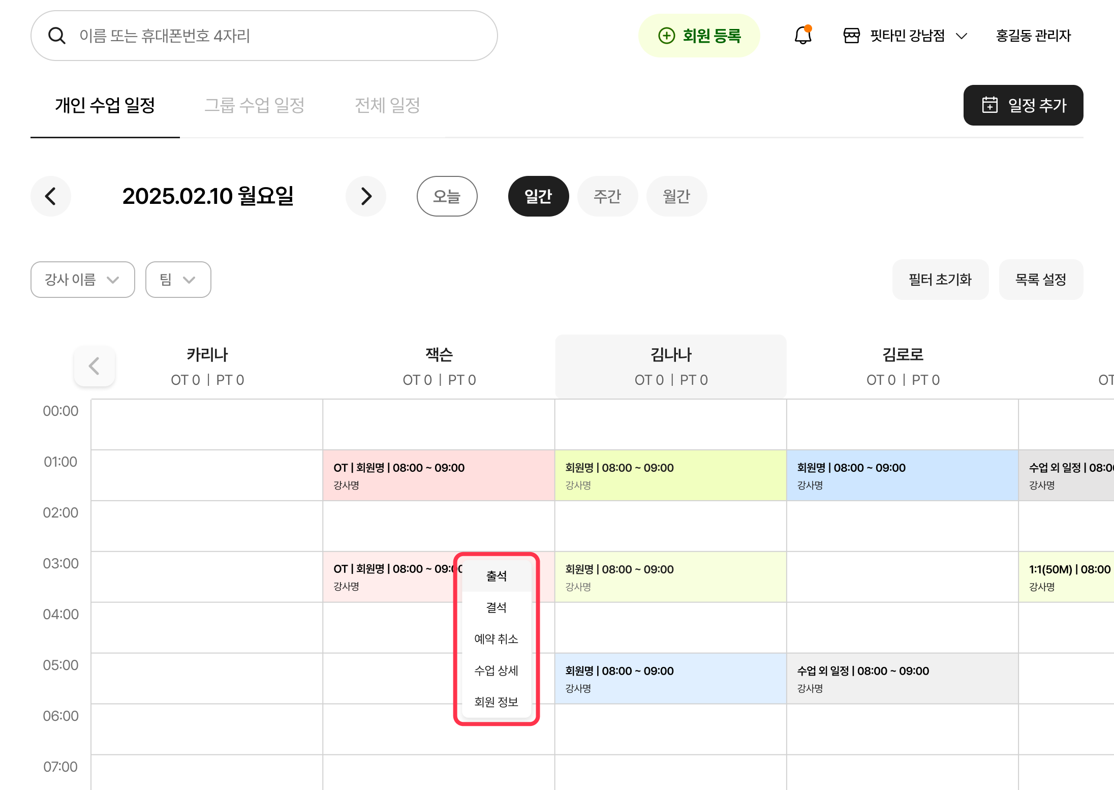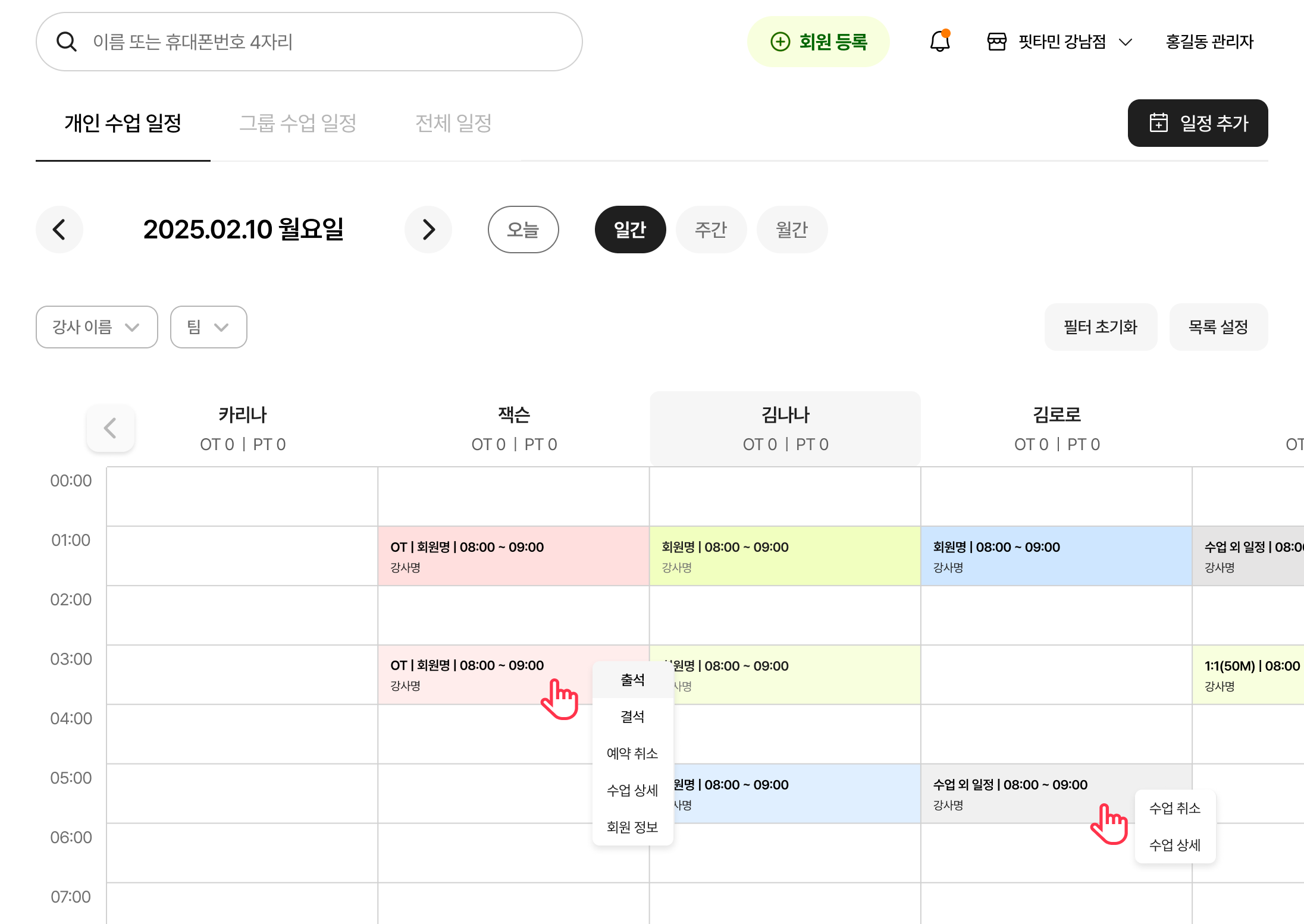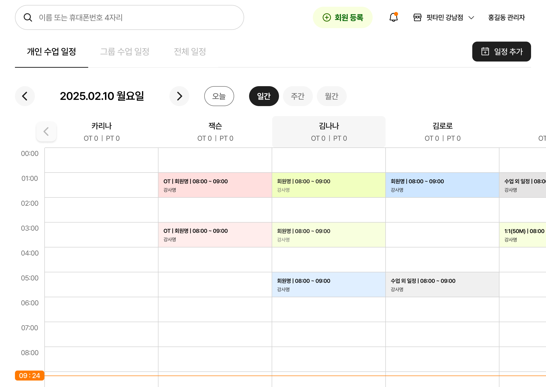 [수업 일정 > 개인 수업 일정 > 일간 캘린더]에서 강사명 아래 하루동안 진행하는 OT , PT 수업 개수가 표시됩니다.