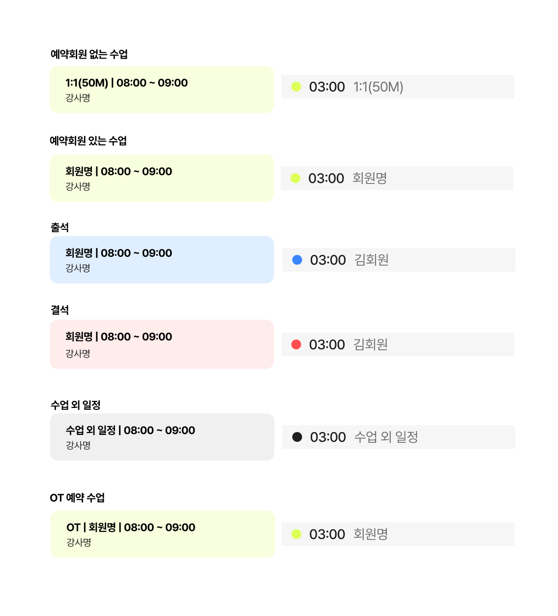 수업 예약 상태와 회원 출결 현황을 색깔로 확인할 수 있어요.