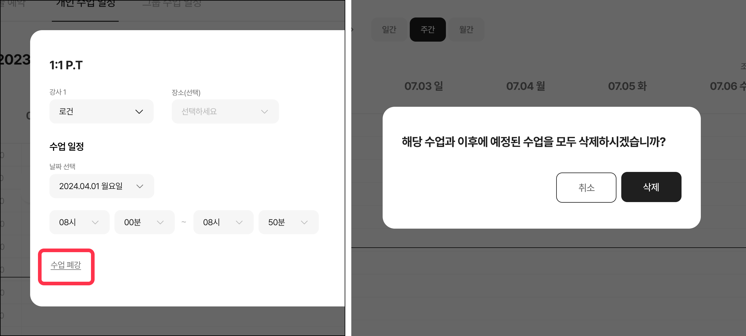 삭제할 수업의 [수업 일정 상세] 팝업 하단에서 수업 폐강 버튼을 클릭한 후 삭제 버튼을 누르면 등록한 수업이 삭제됩니다.
