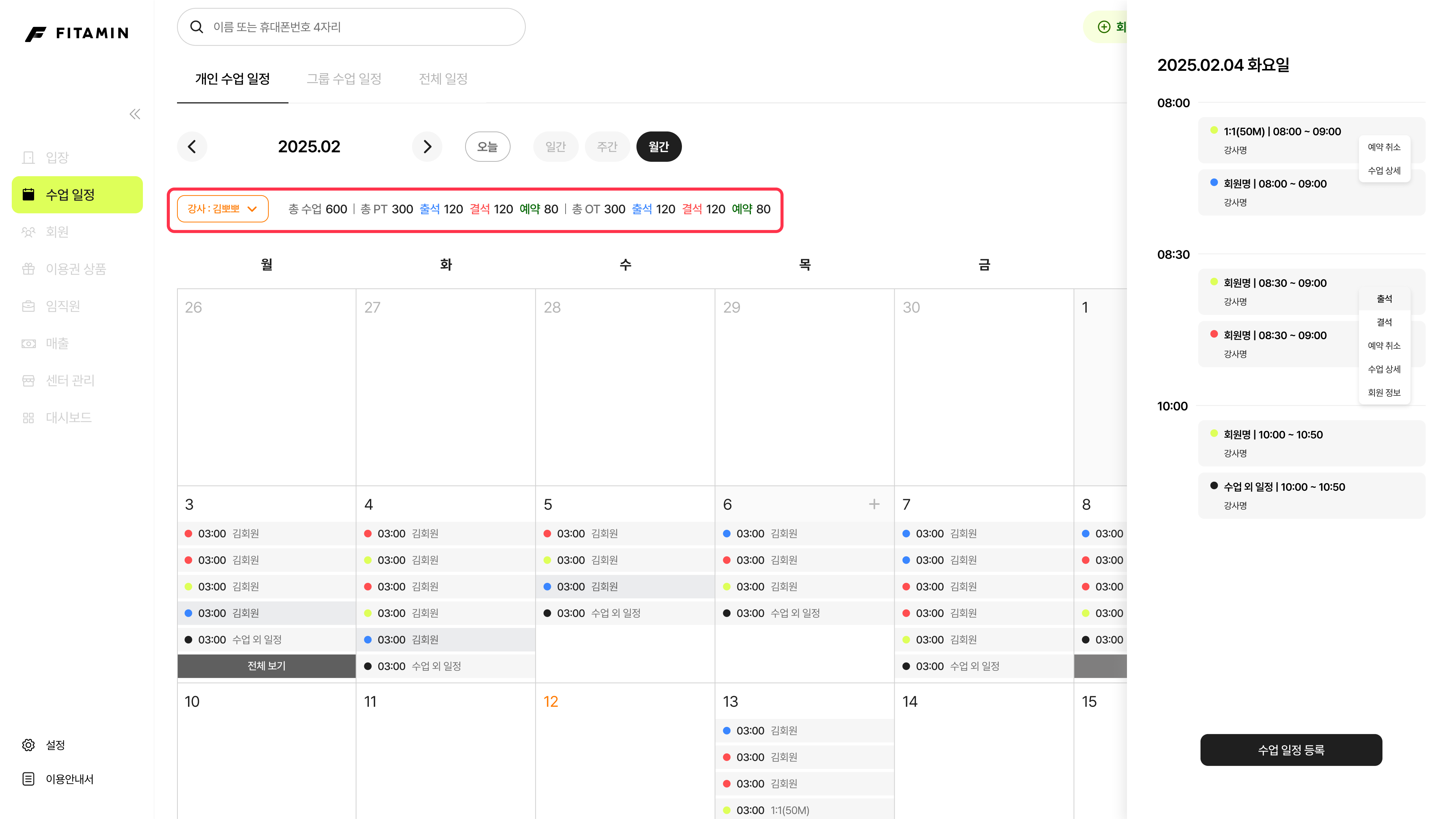 왼쪽 메뉴에서 수업일정 을 선택해주세요. 센터의 수업일정과 예약 회원, 출석 현황을 한 눈에 확인할 수 있어요.