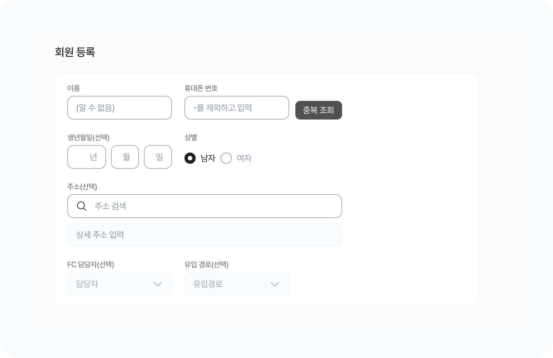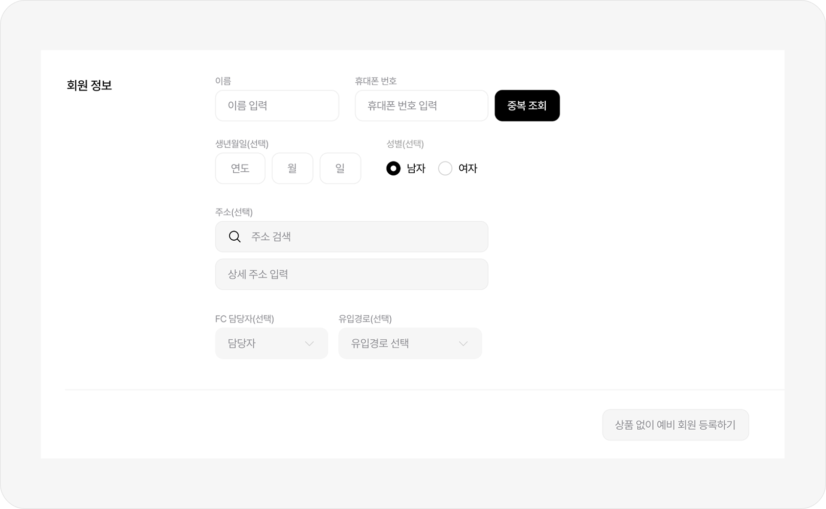 중복 조회버튼을 클릭하여 이미 등록된 회원은 아닌지 확인해주세요. 이미 등록된 회원이라면 등록된 회원정보를 불러옵니다.생년월일(선택) : 회원의 생년월일을 등록할 수 있어요.