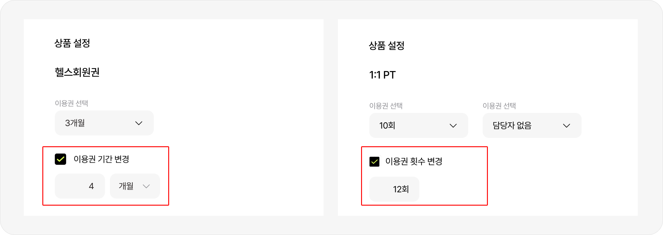 이용권 선택 후 하단의 이용권 기간 변경 / 이용권 횟수 변경 체크박스를 선택하면 원하는 이용권 조건을 직접 입력할 수 있어요.