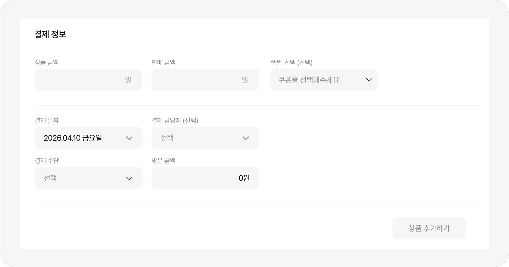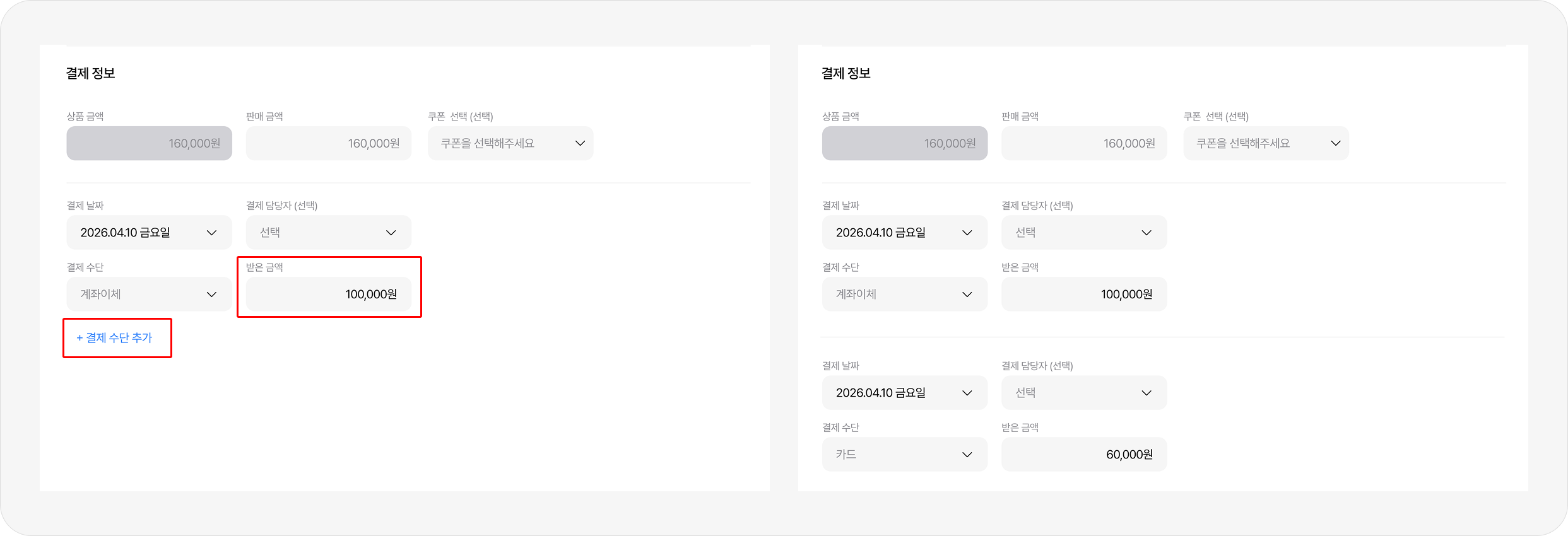 [+] 결제 수단 추가버튼이 생성됩니다.해당 버튼을 눌러 결제 수단과 결제 금액을 추가할 수 있어요.