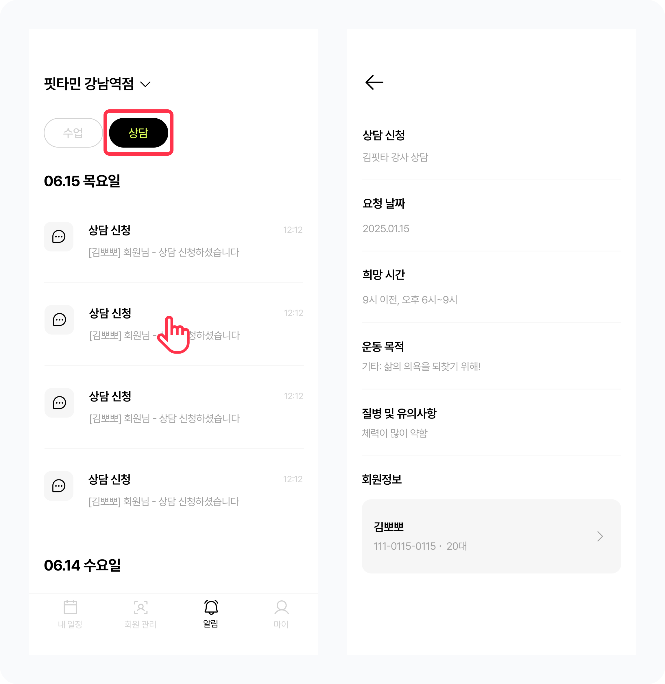 상담 탭을 선택하면 회원이 상담 신청한 내역을 확인할 수 있어요.