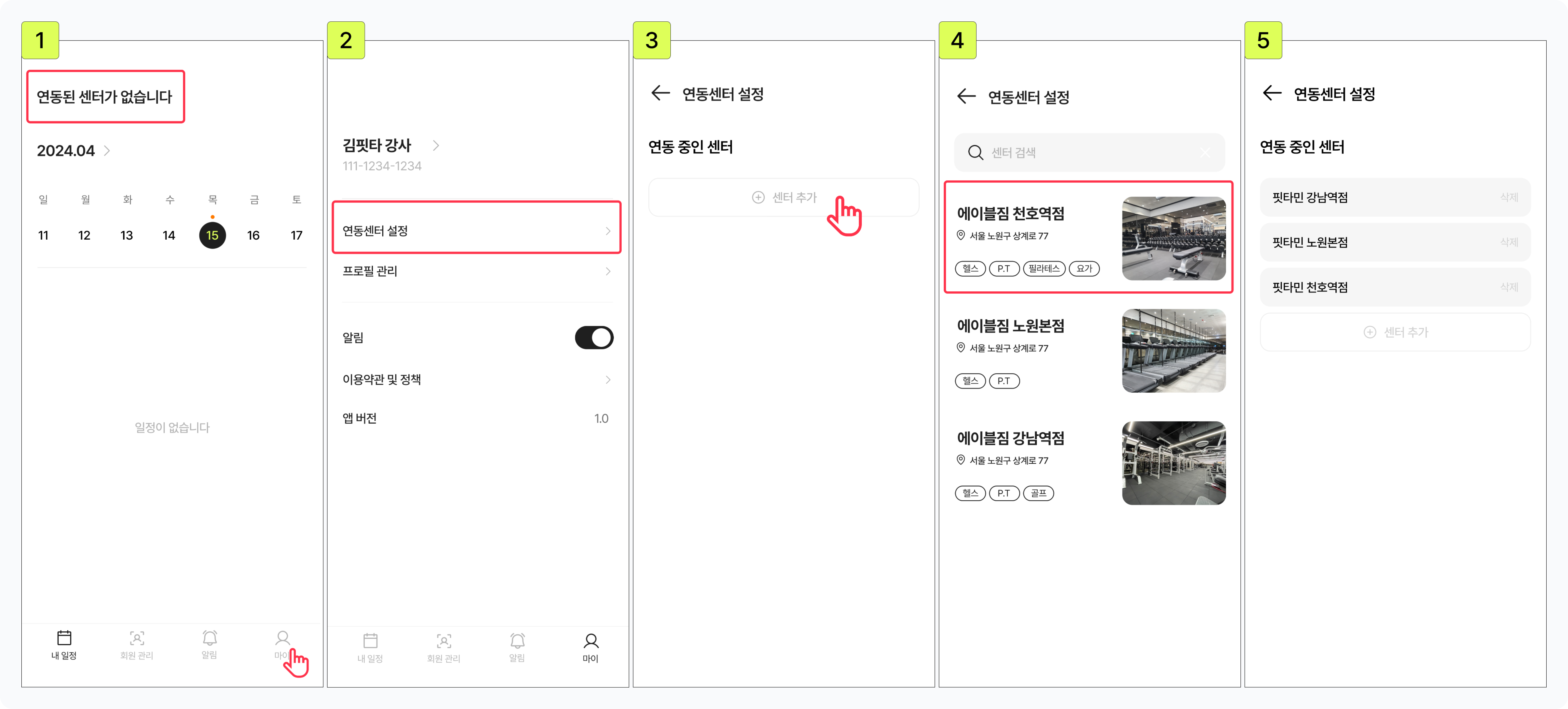 [강사앱]에서 회원과 수업일정을 관리하고 프로필을 등록하기 위해서는 꼭 센터를 연동해주세요.