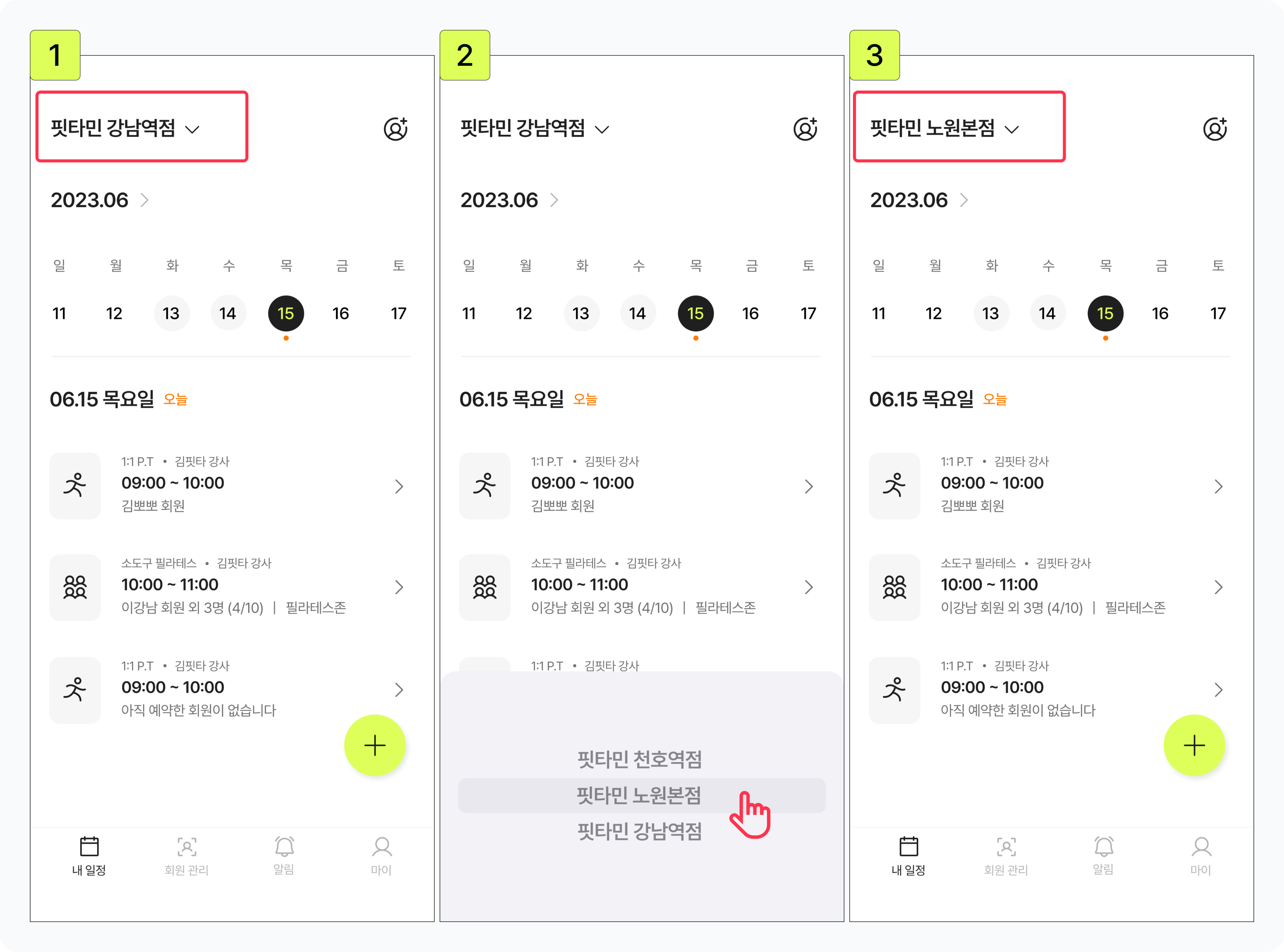 대표 연동센터가 변경되고 변경된 센터의 수업 일정과 회원 정보가 표시돼요.
