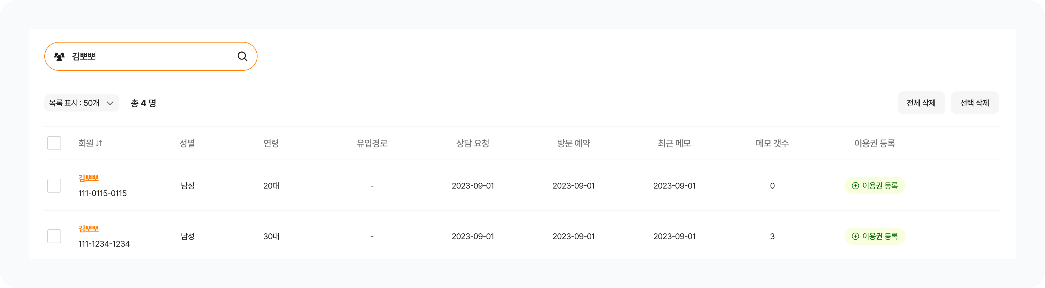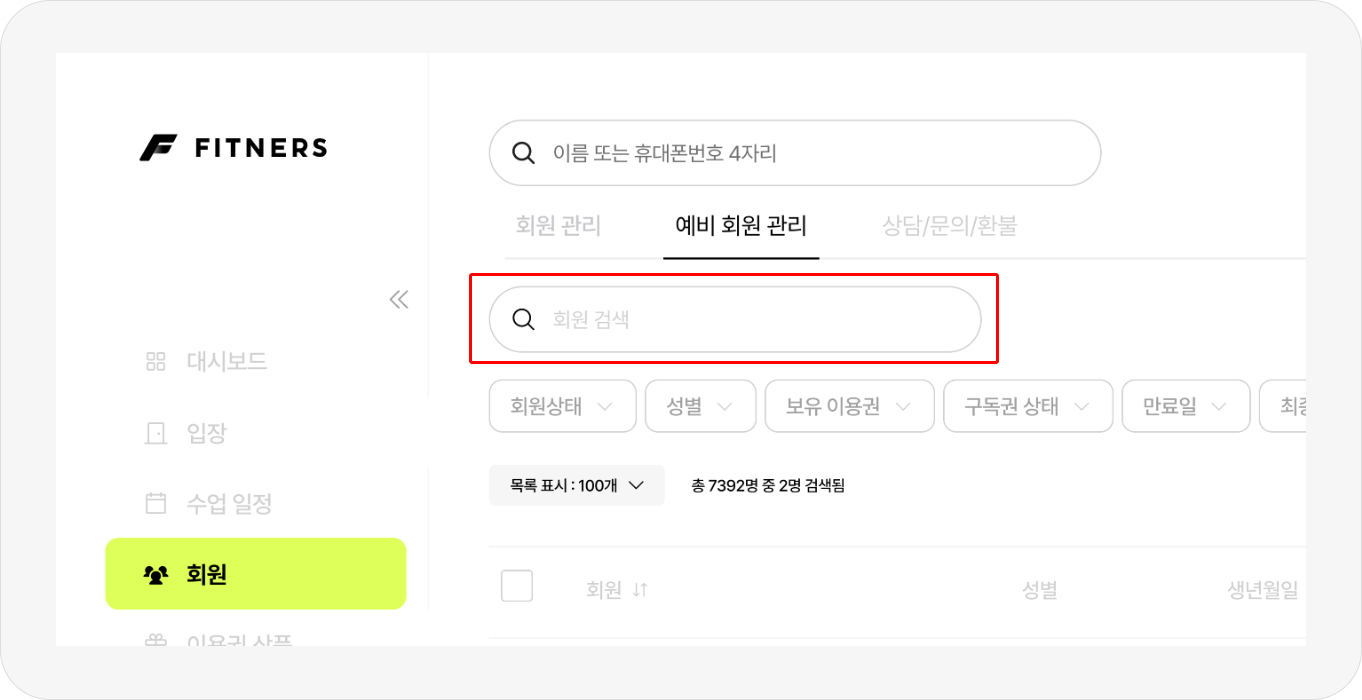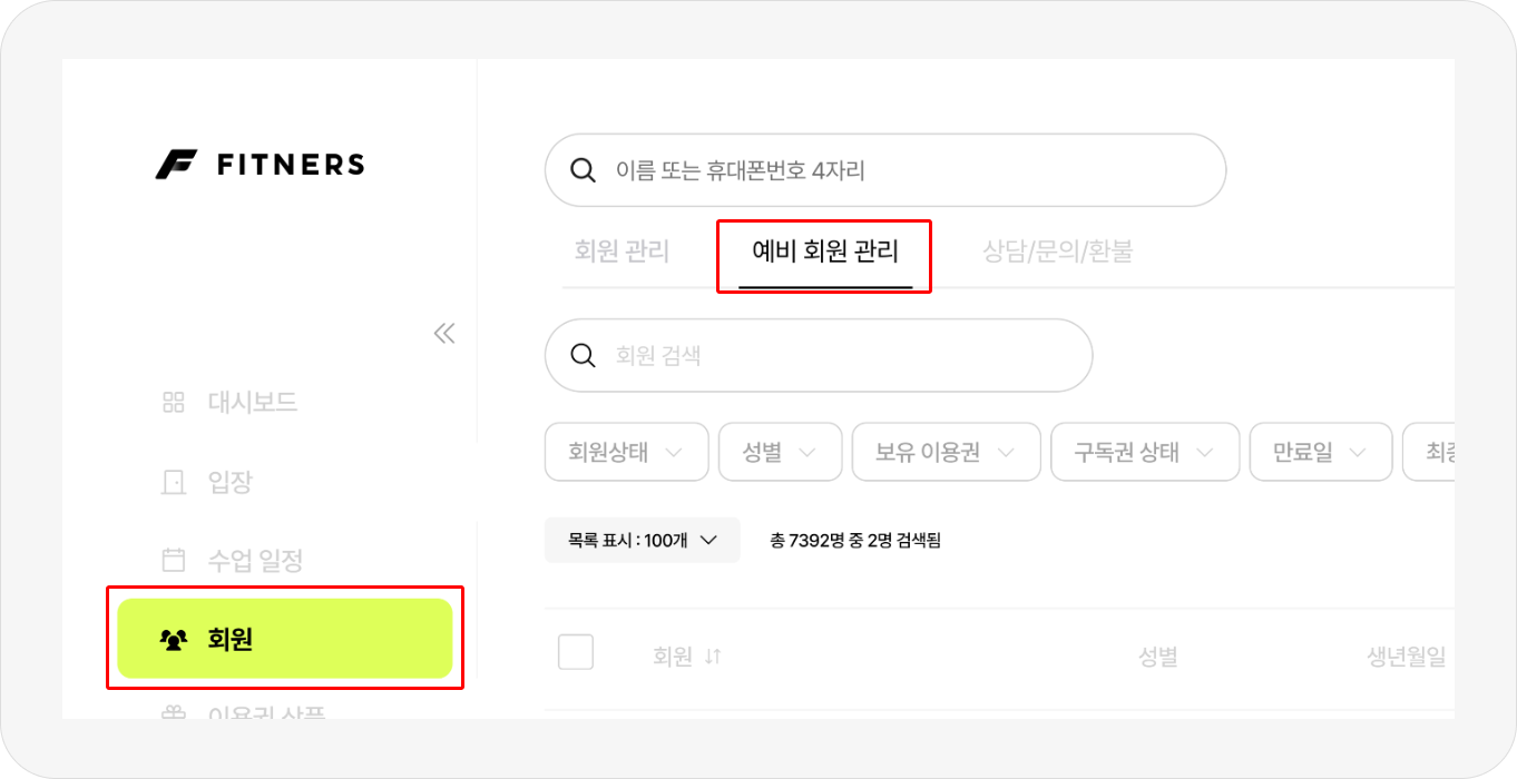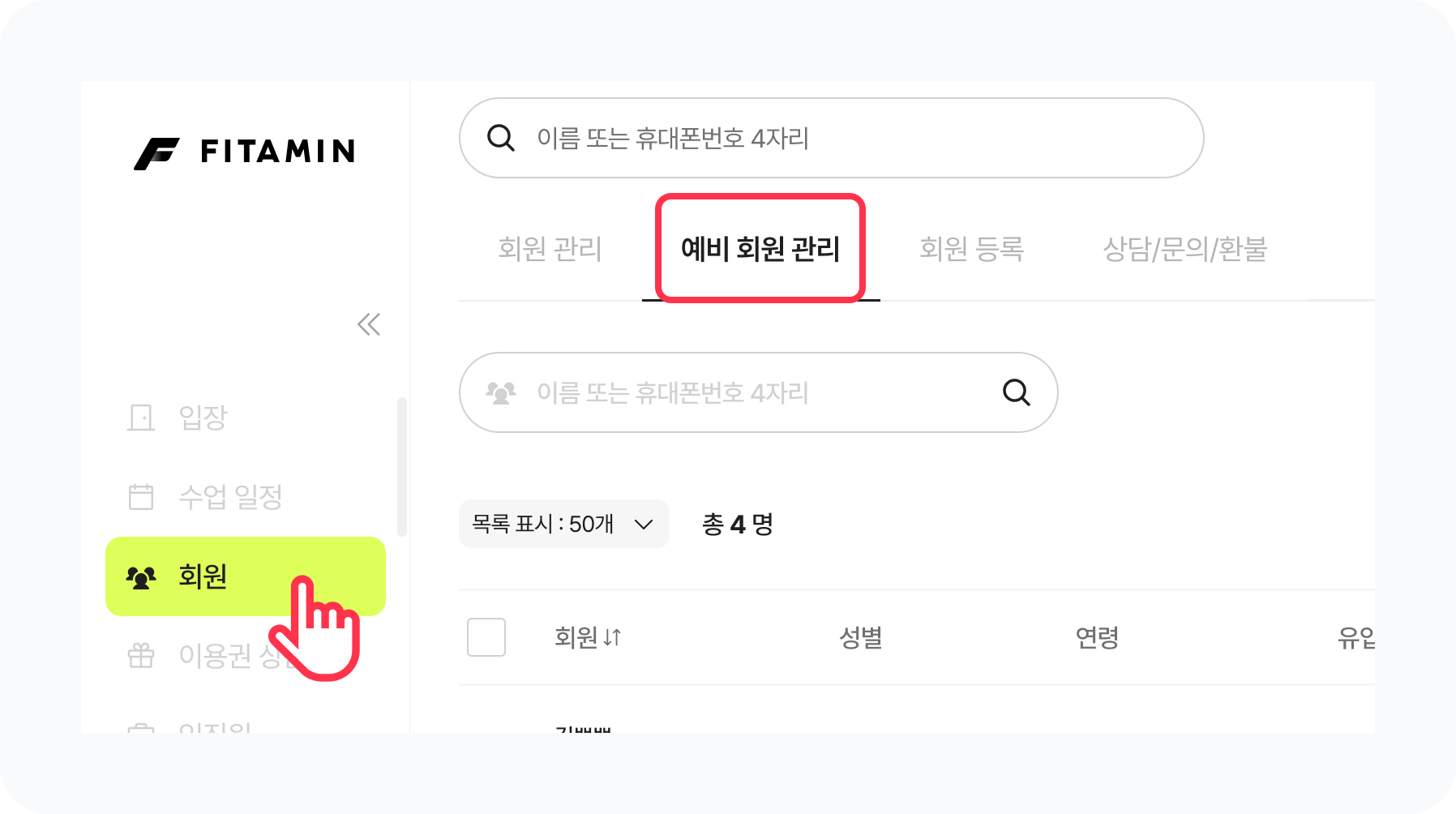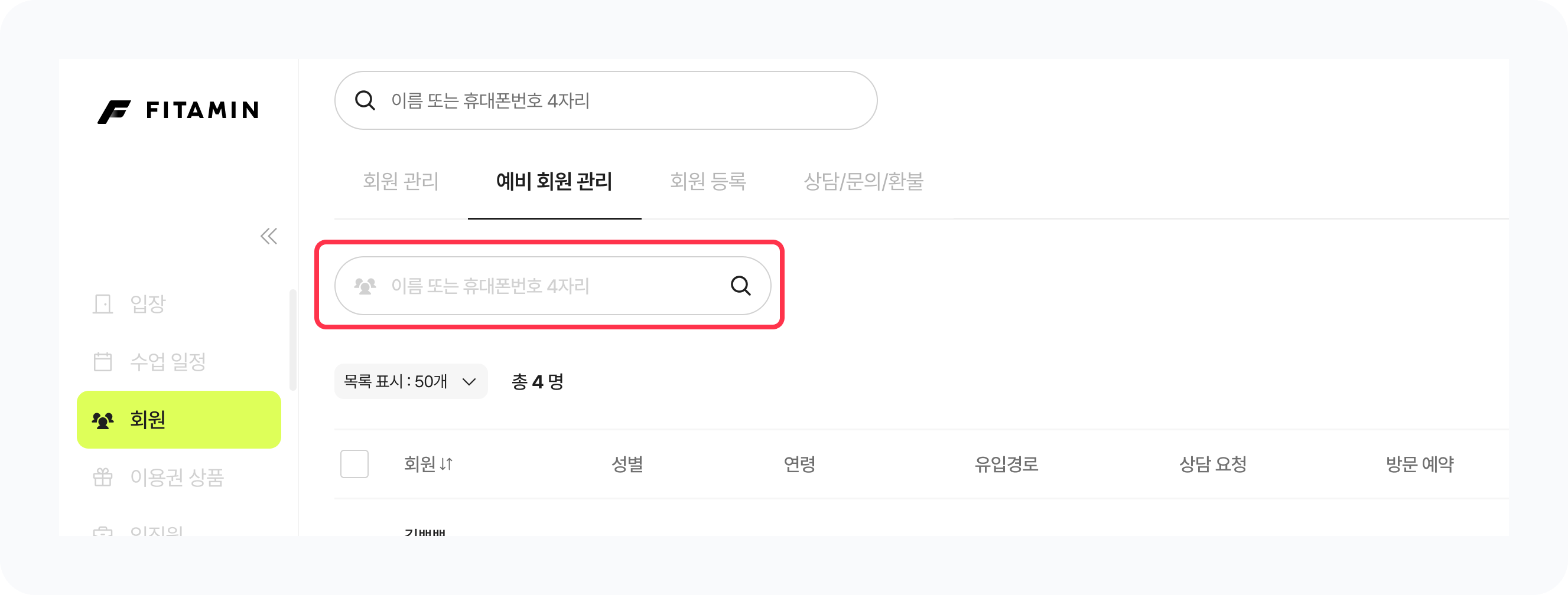 상단의 회원 검색창에서 예비 회원의 이름 또는 휴대폰 번호 4자리를 입력하여 예비 회원을 검색할 수 있어요.