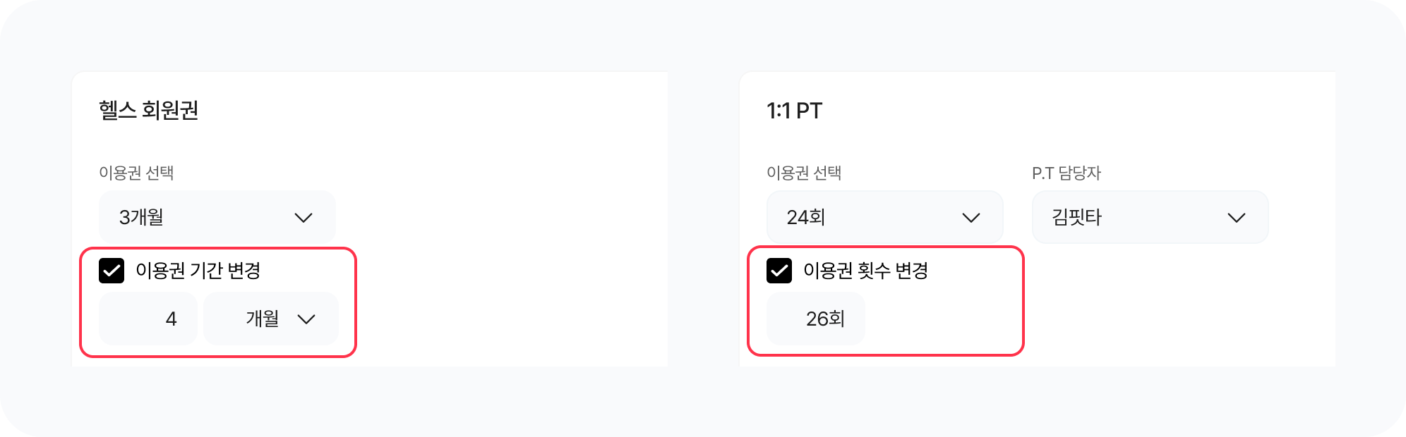 이용권 선택 후 하단의 이용권 기간 변경 / 이용권 횟수 변경 체크박스를 선택하면 원하는 이용권 조건을 직접 입력할 수 있어요.