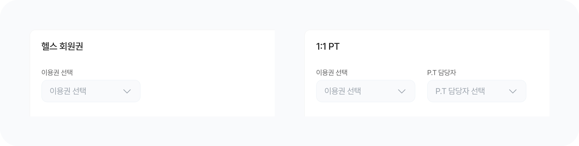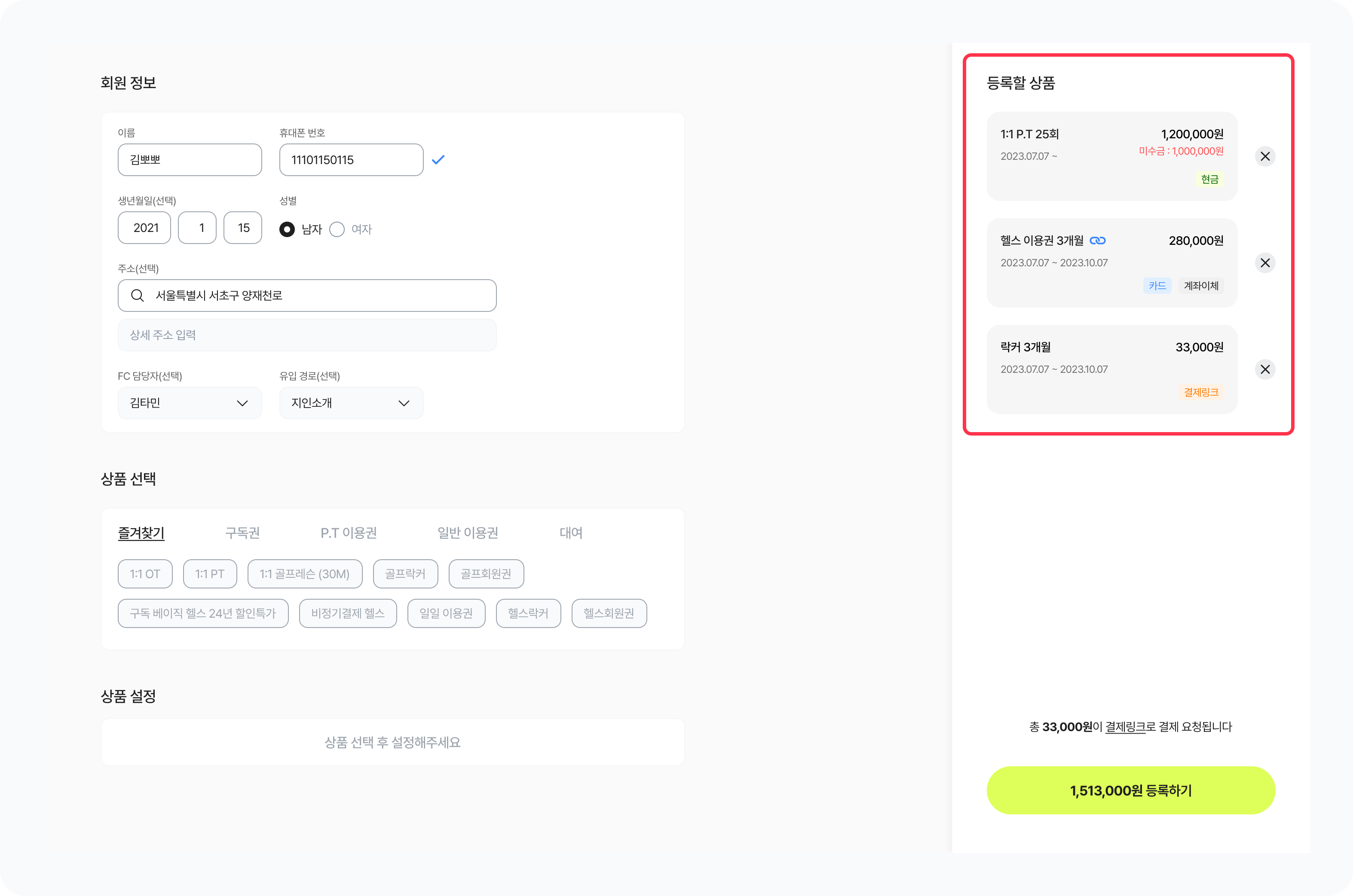 PT 이용권 등록 시 PT 담당자를 설정할 수 있습니다.