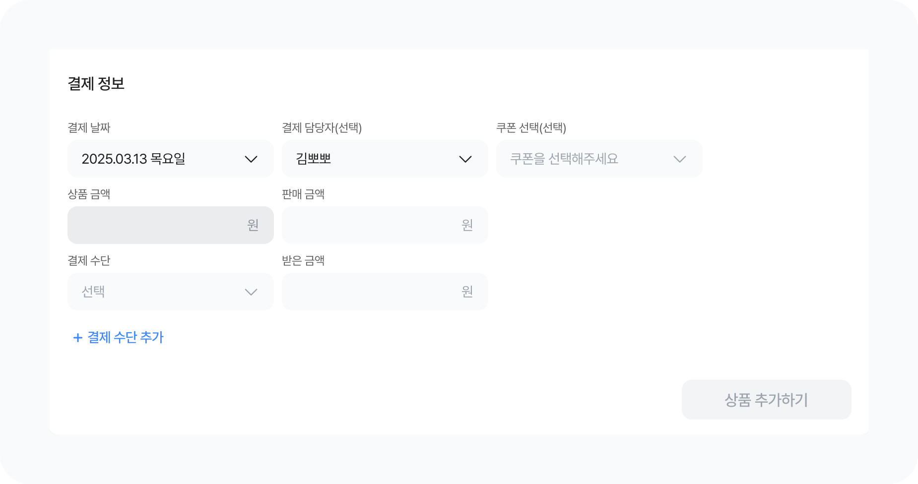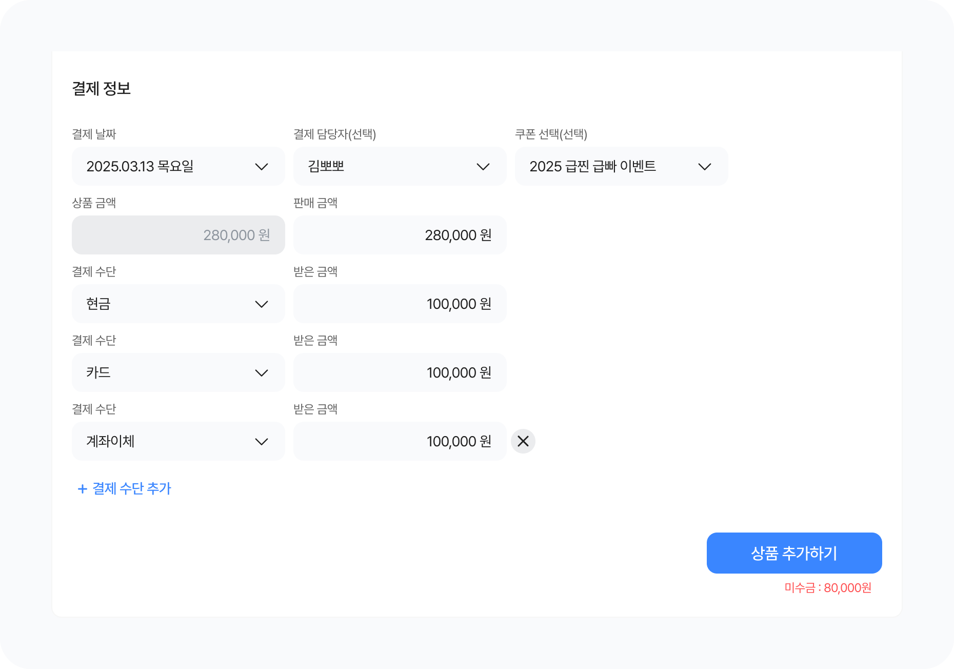[+] 결제 수단 추가버튼을 눌러 결제 수단과 결제 금액을 추가할 수 있어요.