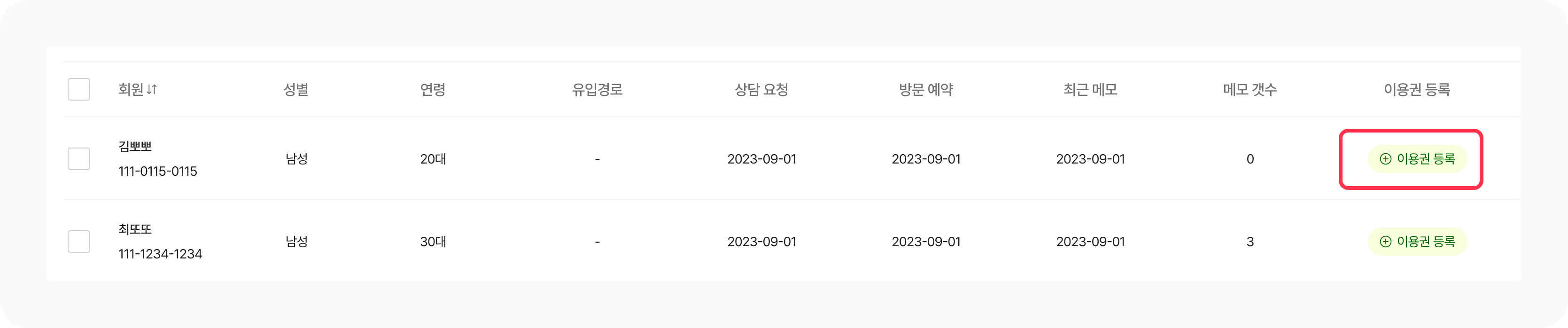 이용권을 등록한 예비 회원은 정식 회원으로 전환되어 [회원 관리 목록]에서 확인할 수 있어요.