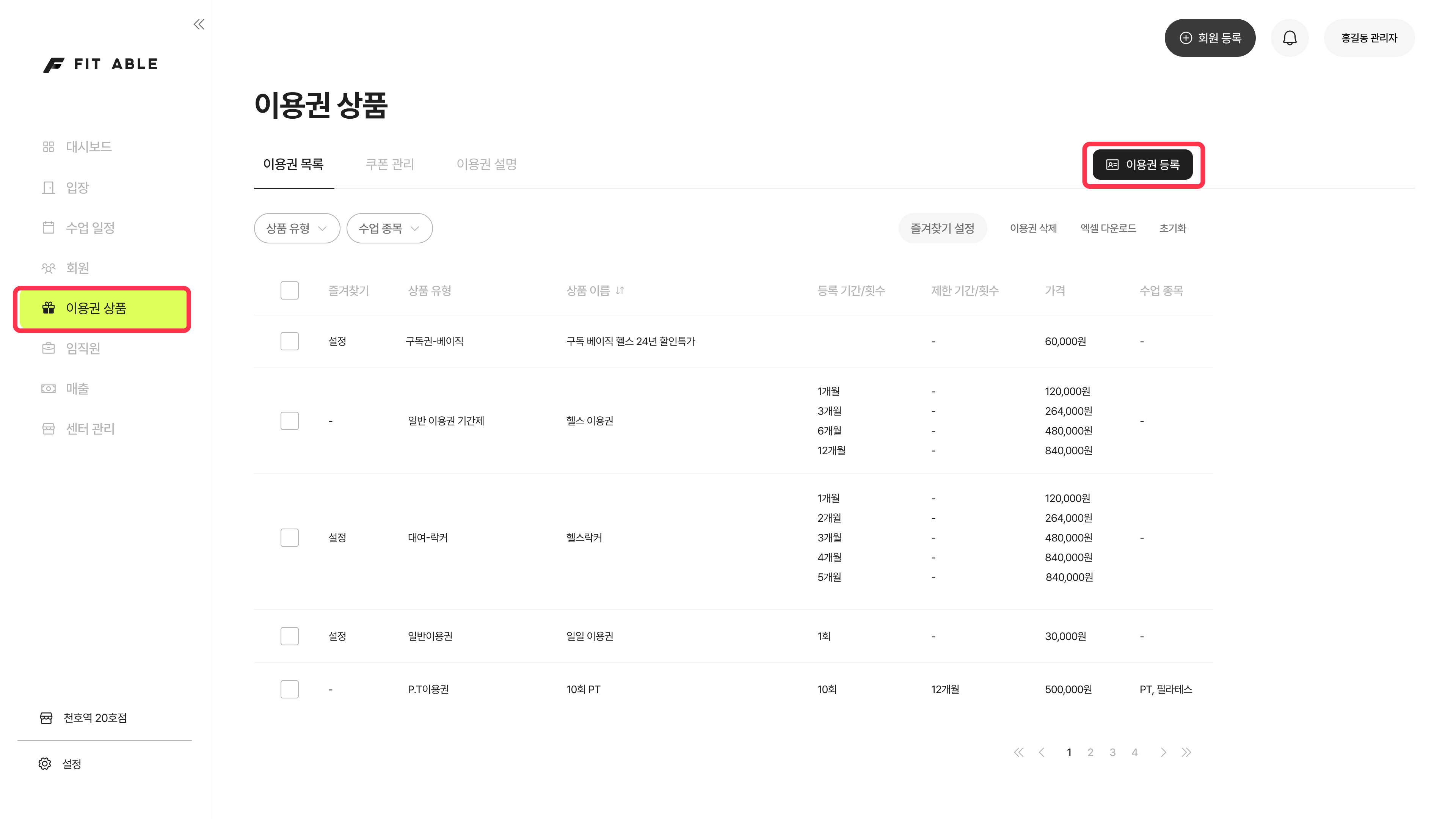 이용권 상품 관리 권한을 가진 관리자는 이용권을 생성 또는 수정할 수 있어요.