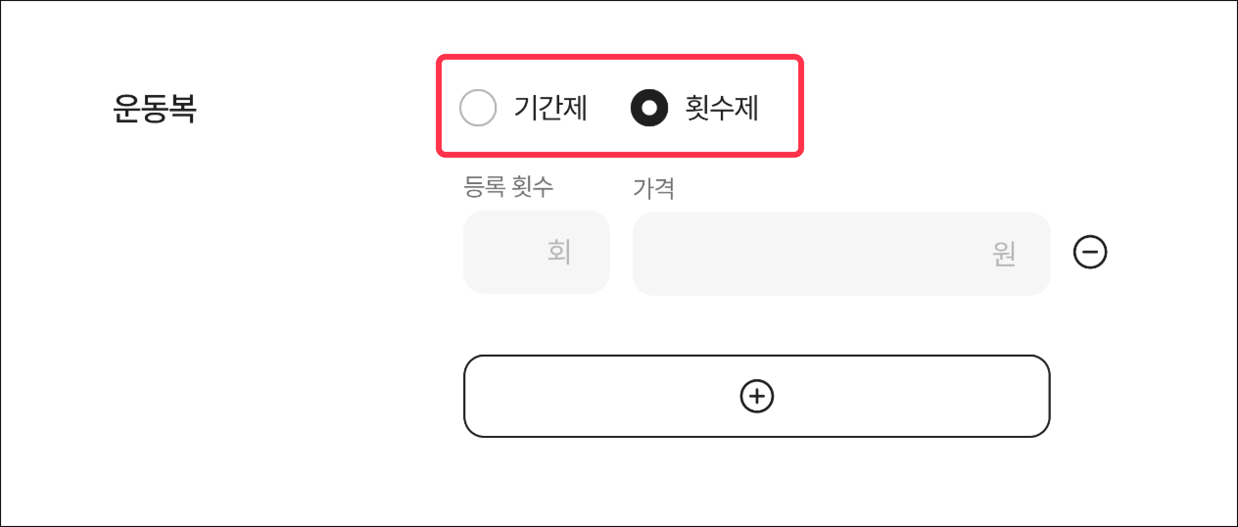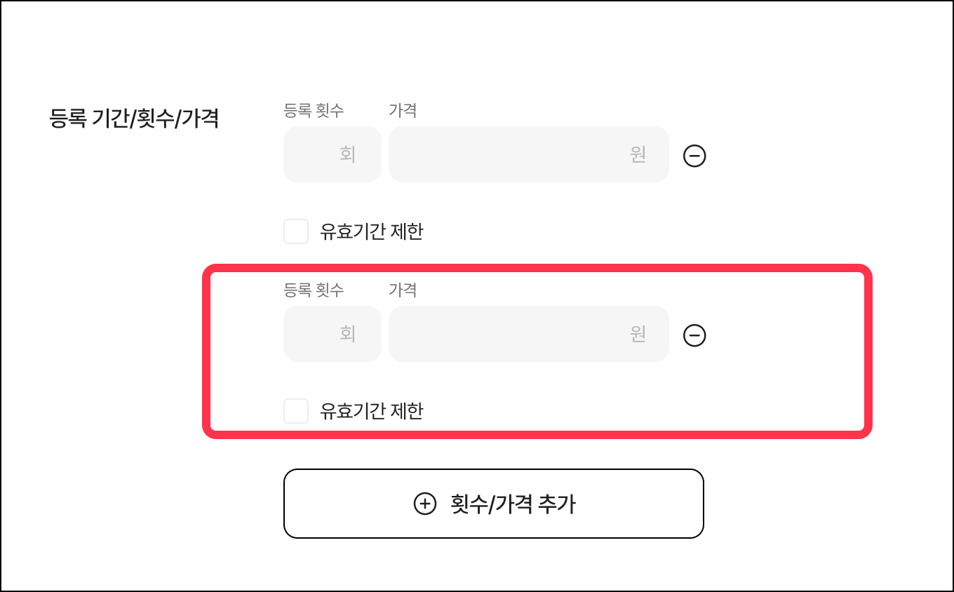 하단의 [+] 횟수/가격 추가 버튼을 클릭하면 하나의 이용권에 여러 횟수를 추가하여 한번에 등록할 수 있어요.
