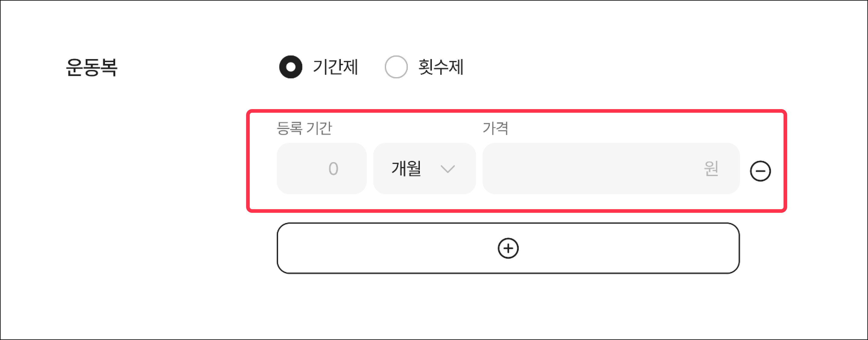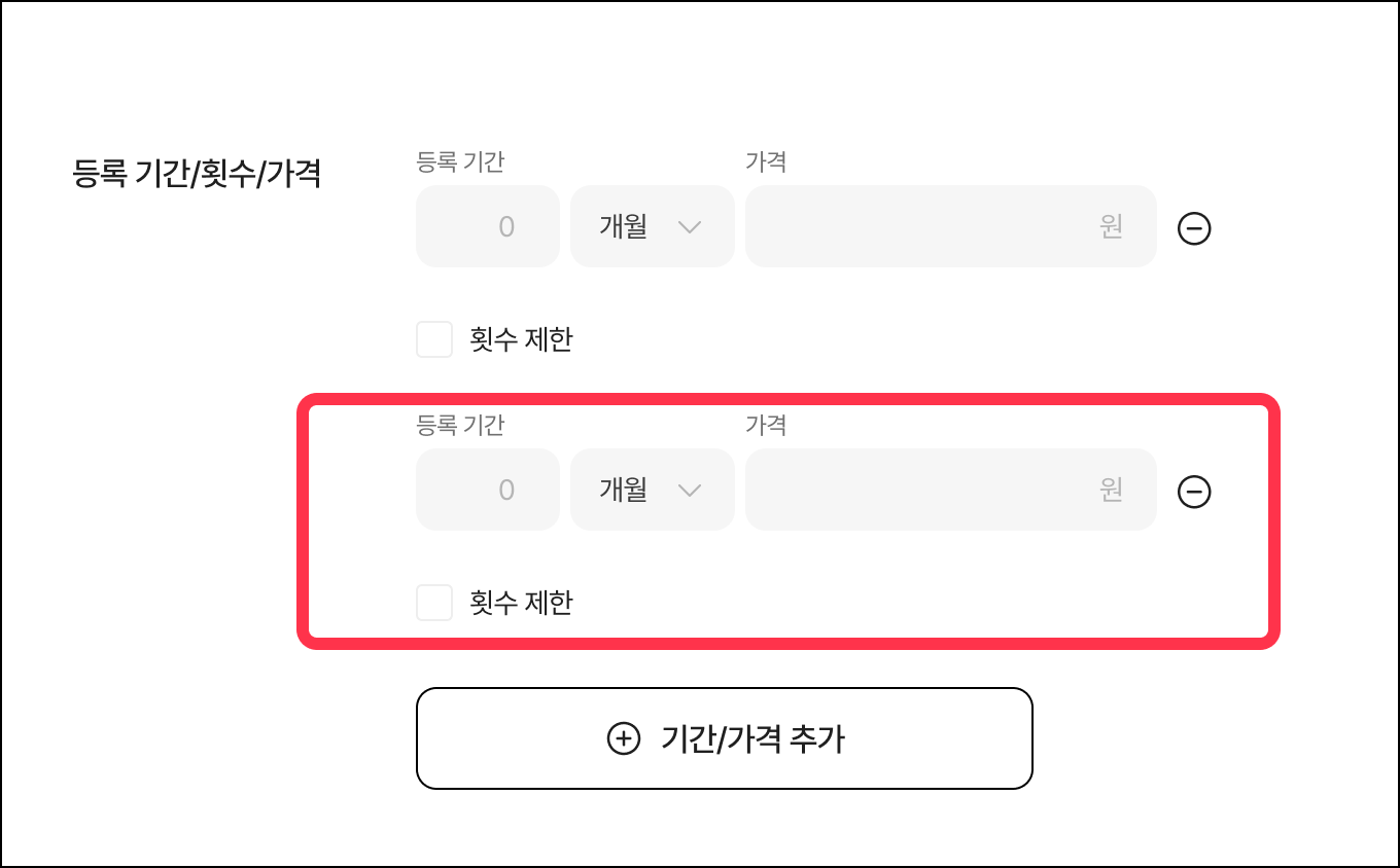 하단의 [+] 기간/가격 추가 버튼을 클릭하면 하나의 이용권에 여러 기간을 추가하여 한번에 등록할 수 있어요.