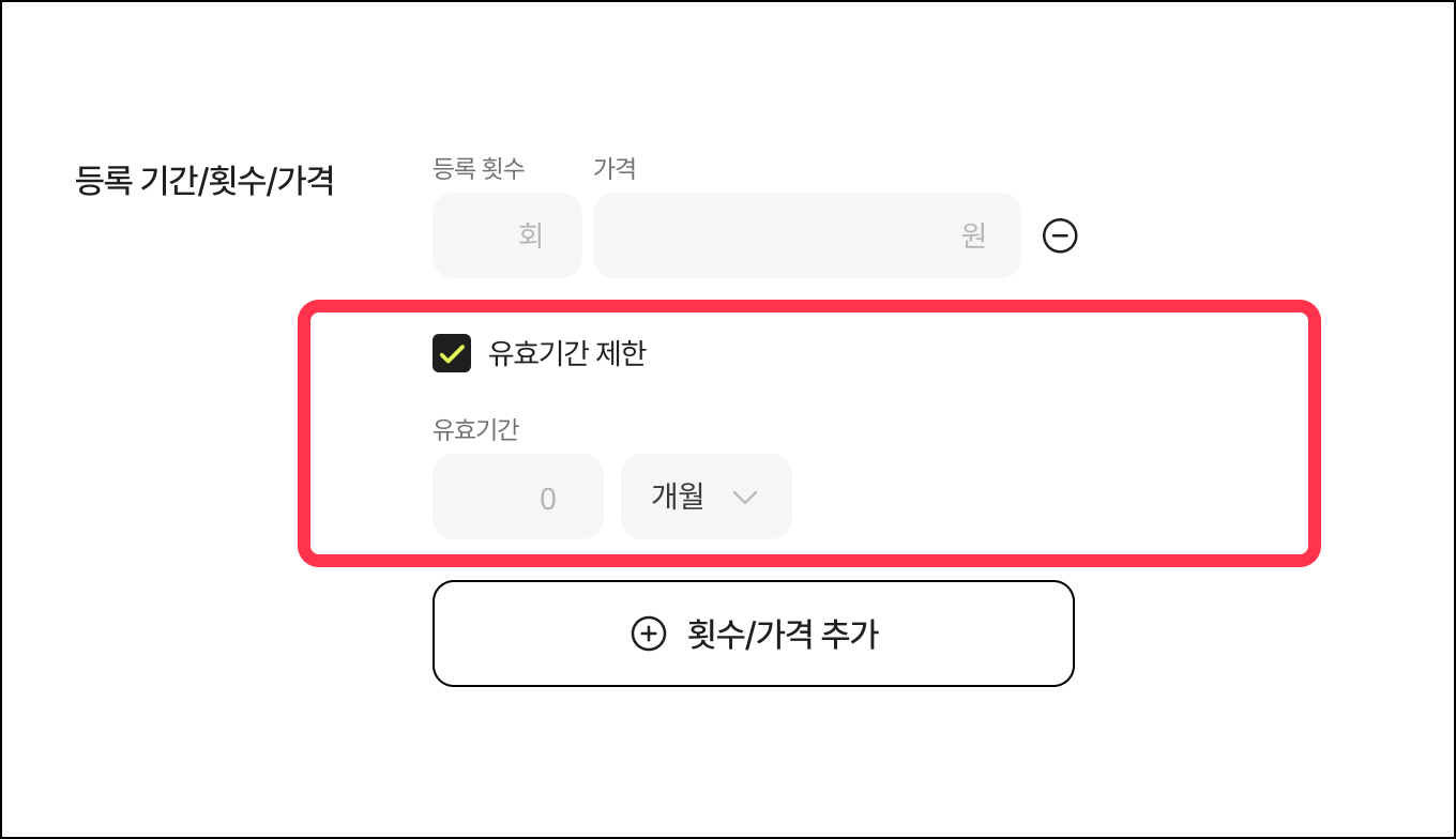 유효기간 제한 체크박스 를 클릭하면 횟수마다 일 / 개월을 기준으로 유효기간 제한을 설정할 수 있는 입력창이 표시돼요.