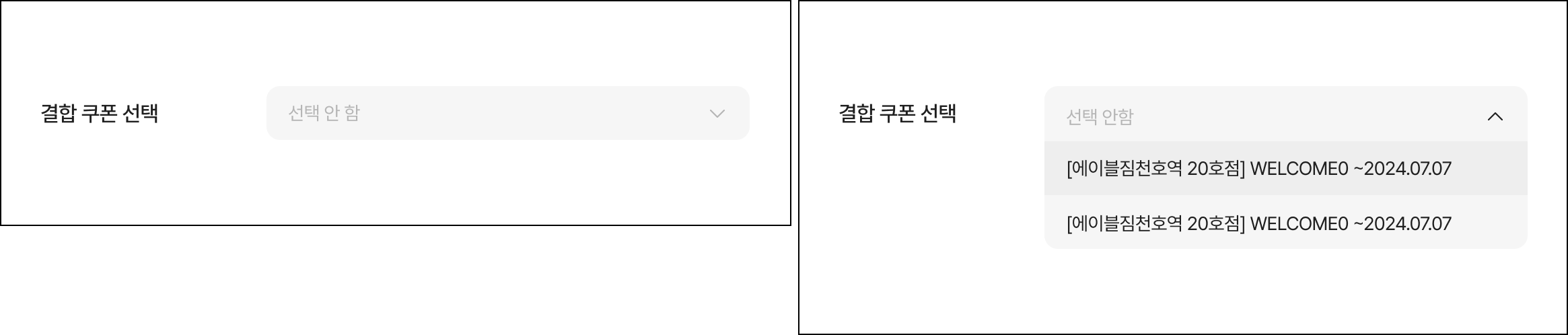 결합 쿠폰 선택 메뉴를 클릭하면 하단에 센터에서 생성한 할인 쿠폰 목록이 표시돼요.