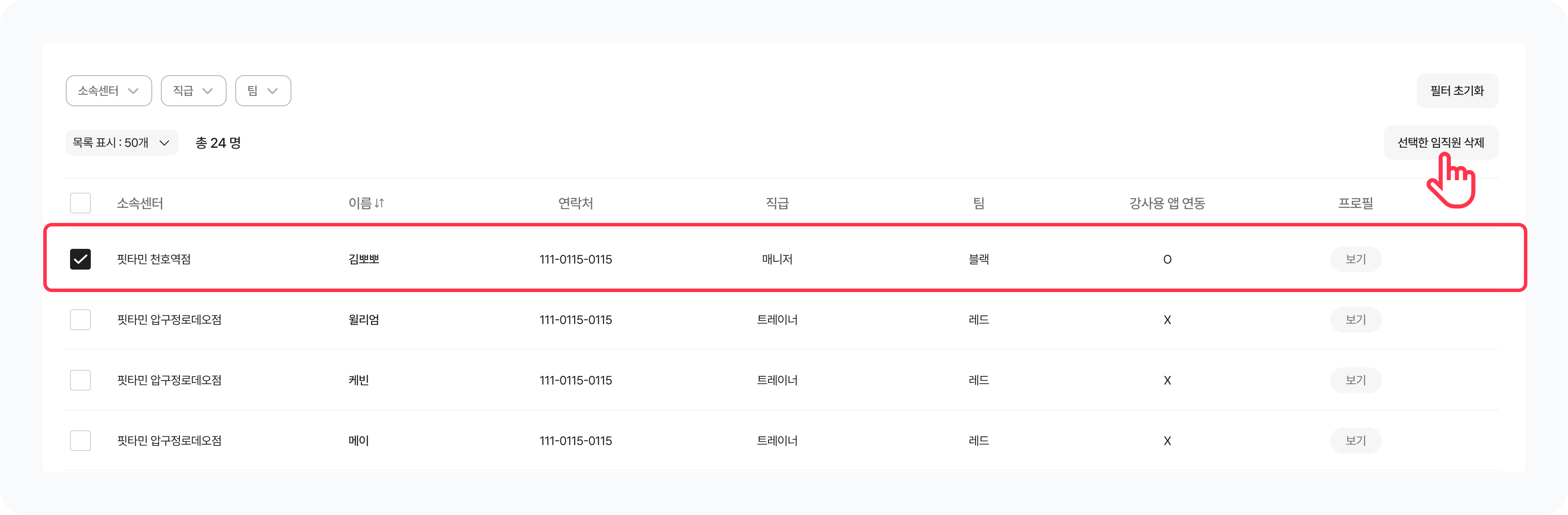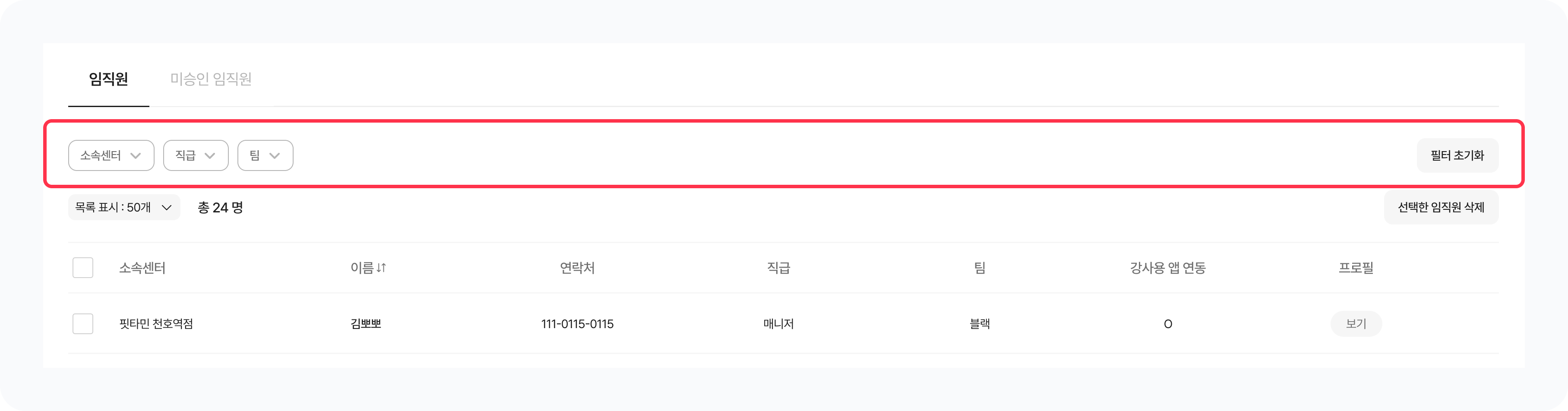 왼쪽 체크박스에서 삭제를 원하는 임직원을 체크하고 우측 상단의 선택 임직원 삭제 버튼을 클릭하면 임직원 계정을 삭제할 수 있어요.
