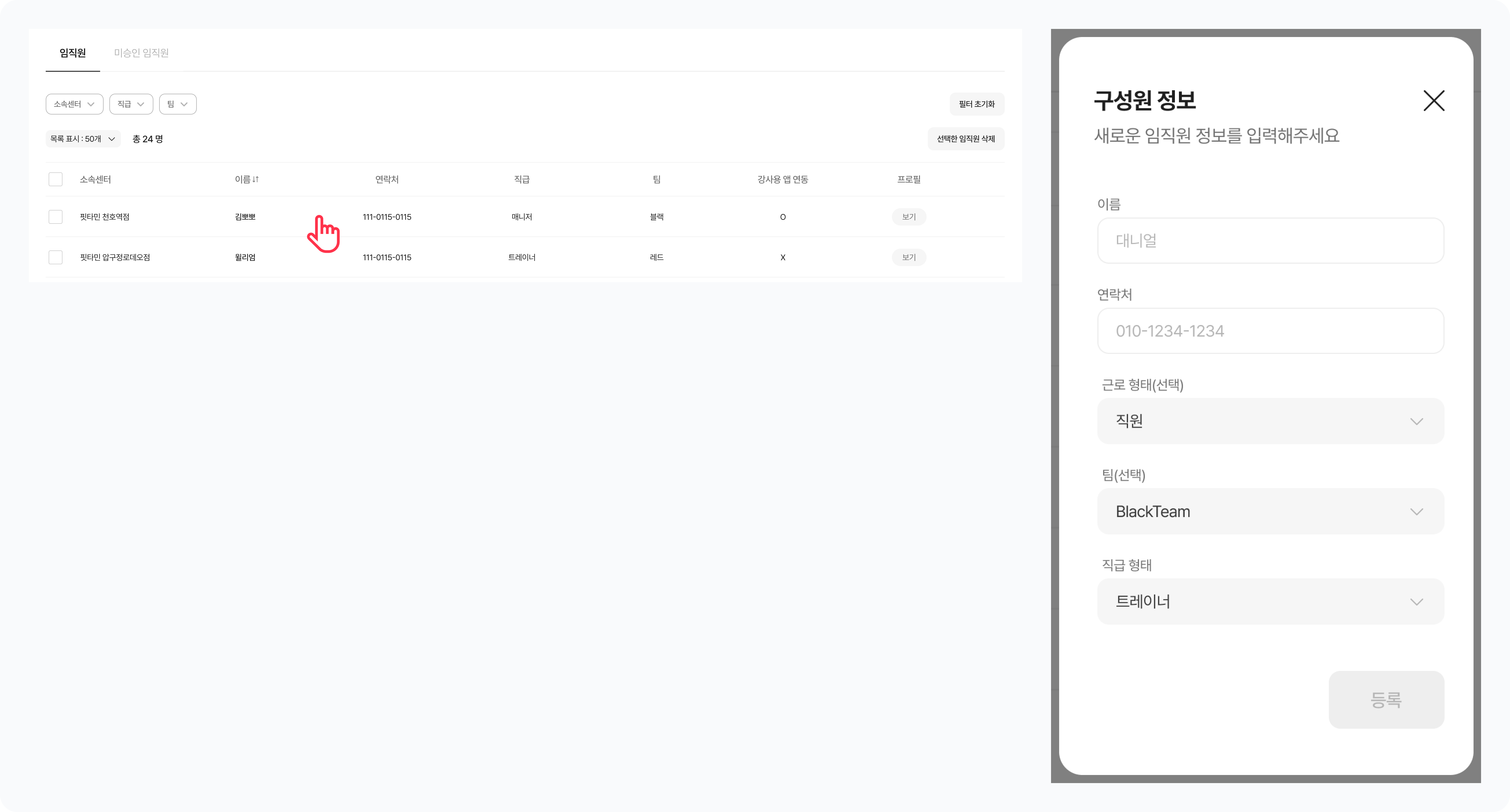 임직원 목록에서 임직원을 선택해 임직원 정보를 수정할 수 있어요.