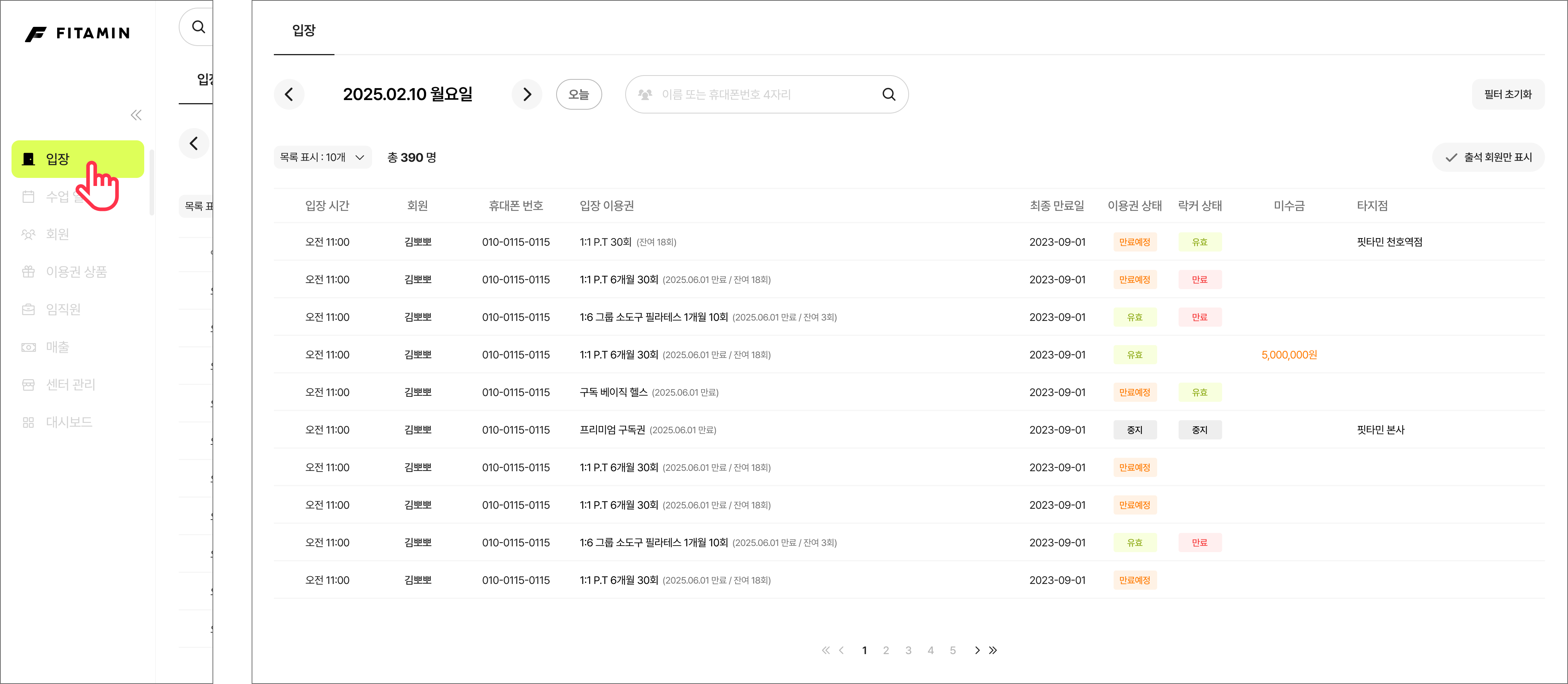 ‘다지점 센터 - 타지점 회원’인 경우 입장 내역에 이용권의 유효 센터가 표시됩니다.