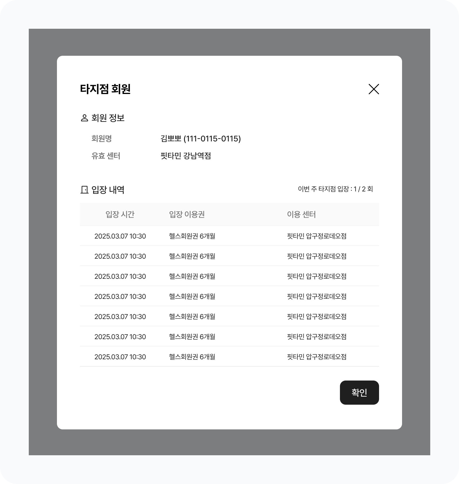 타지점 회원 선택 시 최근 4주의 입장 내역과 이용 센터를 확인할 수 있어요