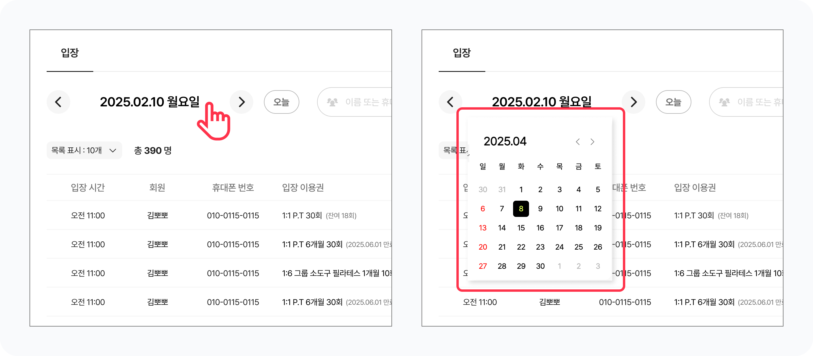 캘린더에서 원하는 날짜를 선택해 입장 회원 목록을 확인할 수 있어요.