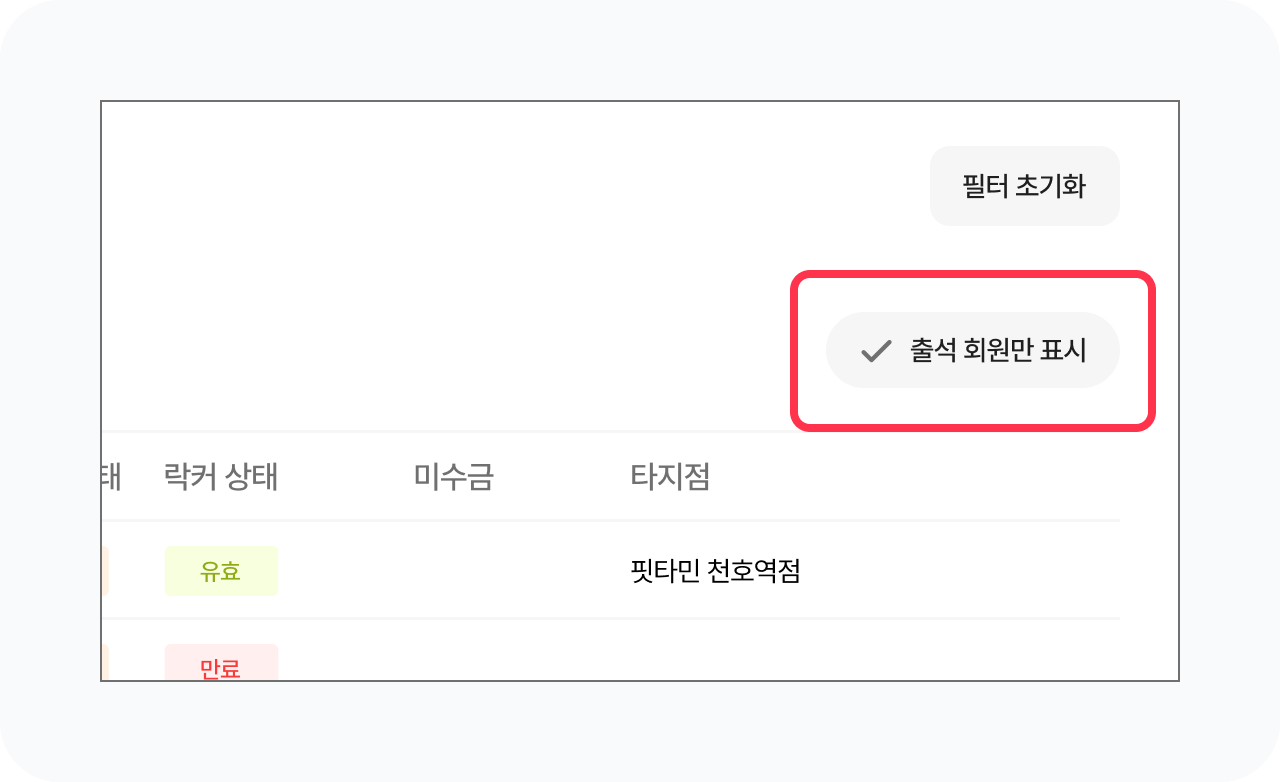 우측 상단의 출석 회원만 보기 버튼을 눌러 현재 센터를 이용중인 회원만 확인할 수 있습니다.