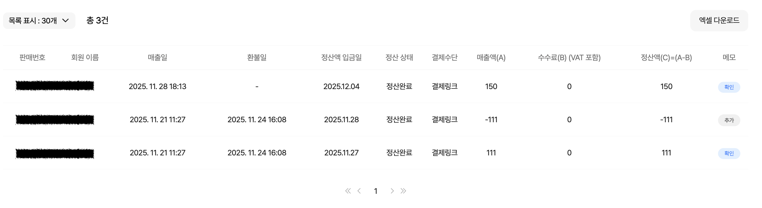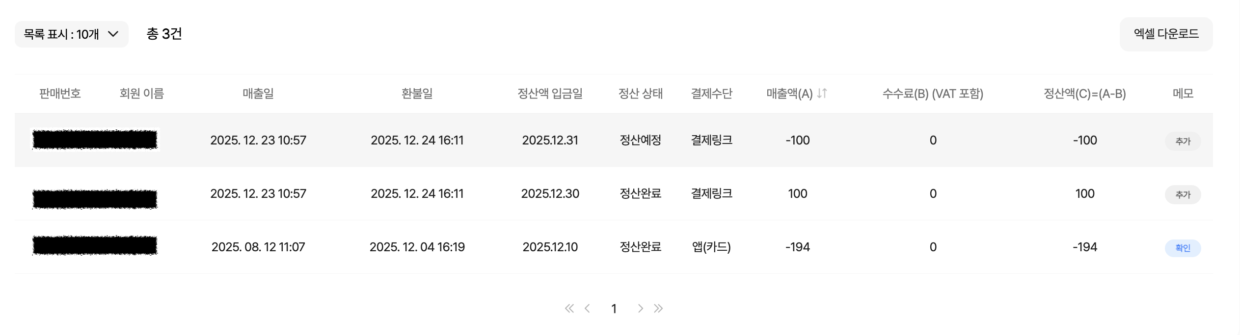 목록에서 정산 내역을 클릭하면 [회원 상세]로 이동합니다.