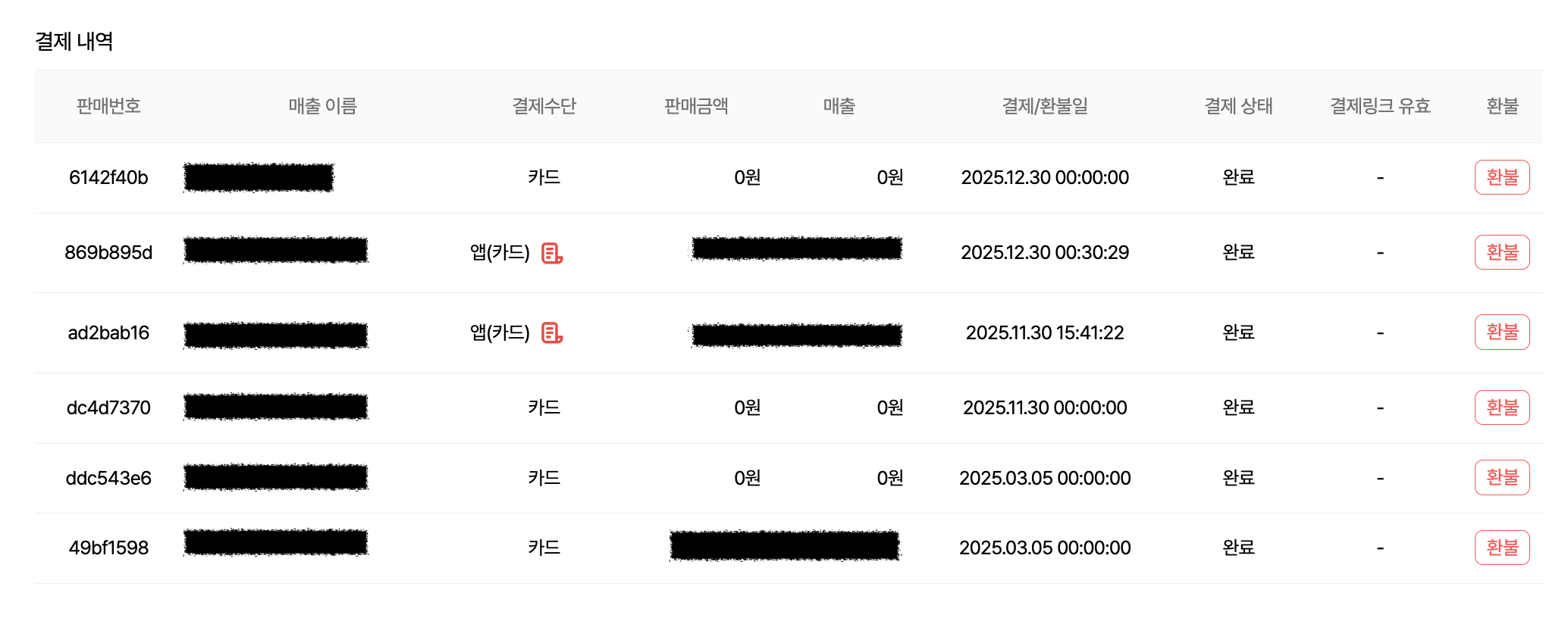 결제 수단 : 결제 링크를 통해 결제한 경우 [결제링크], 회원앱 내에서 카드 결제를 진행한 경우 [앱(카드)]로 표기합니다.