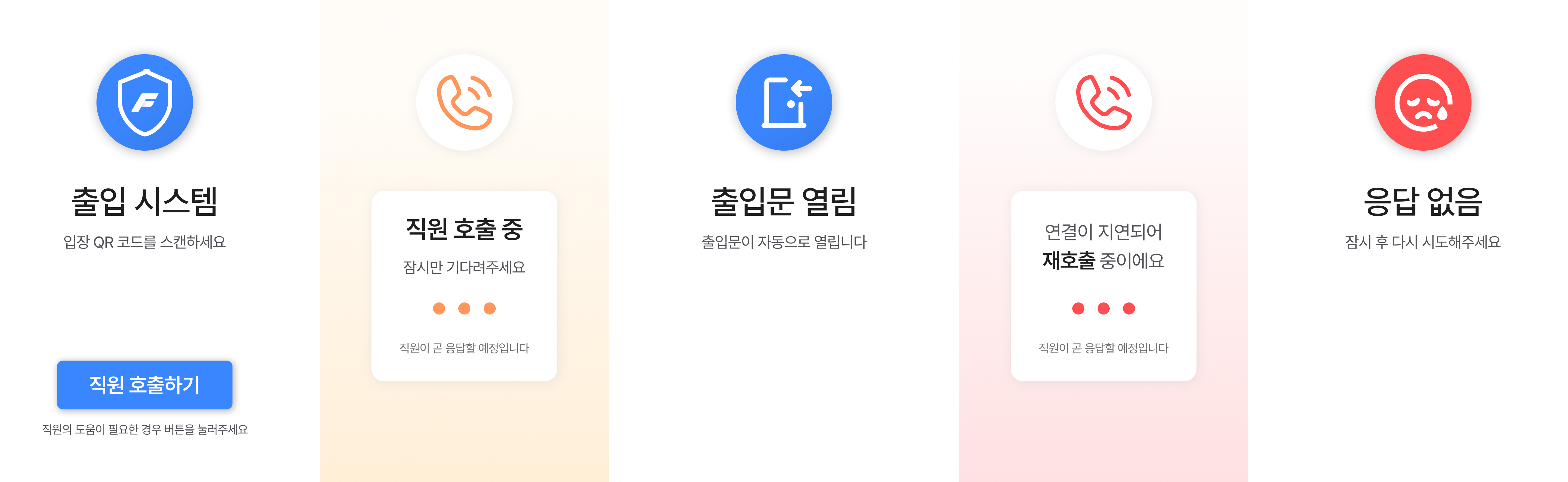 회원이 회원앱으로 입장할 수 없는 상황에서, 출입문 기기의 직원 호출 기능을 이용하여 직원을 호출할 수 있어요