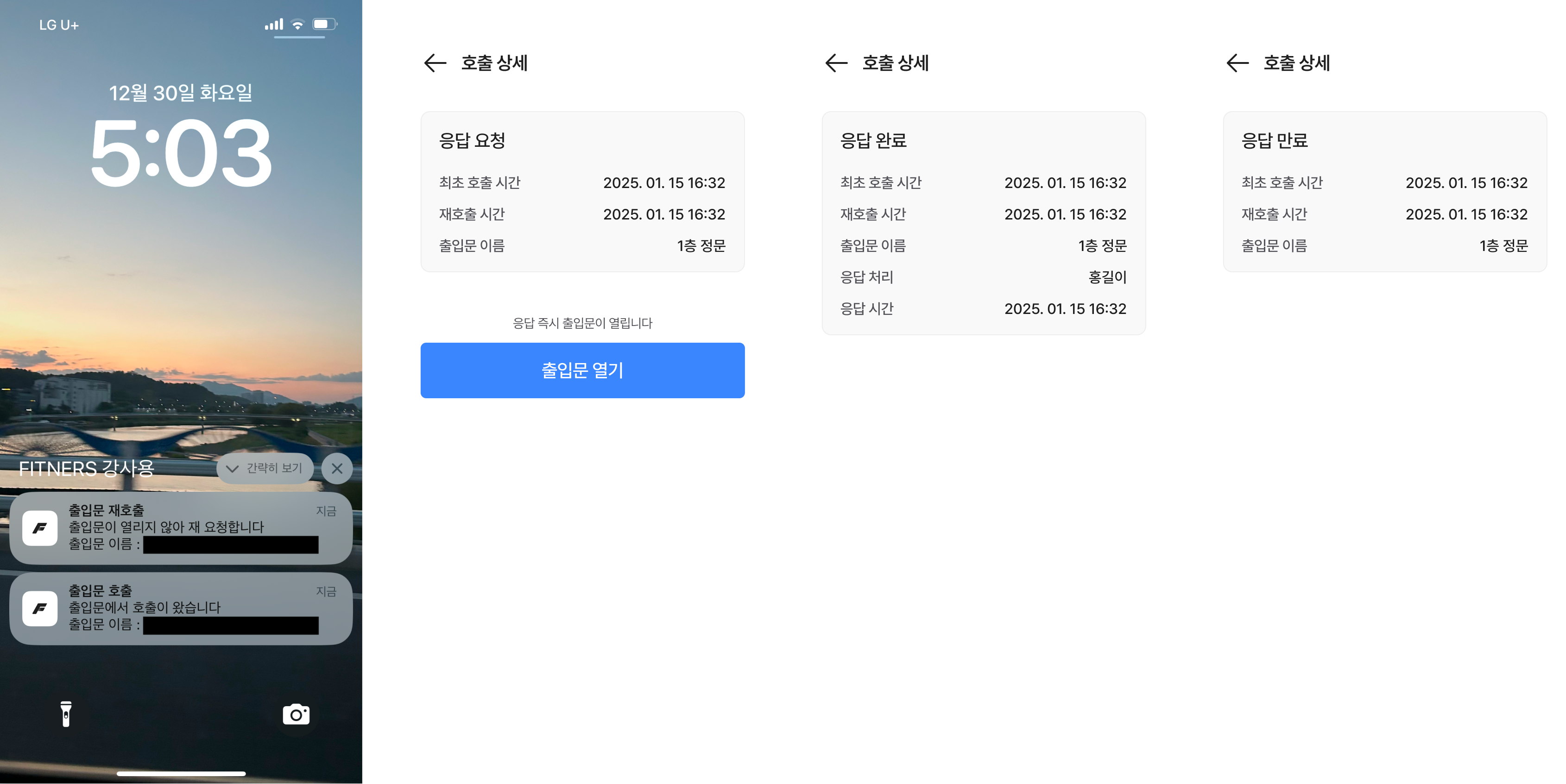 푸시 알림 클릭 시 호출 상세 화면에서 출입문 정보와 호출 정보를 확인하고,