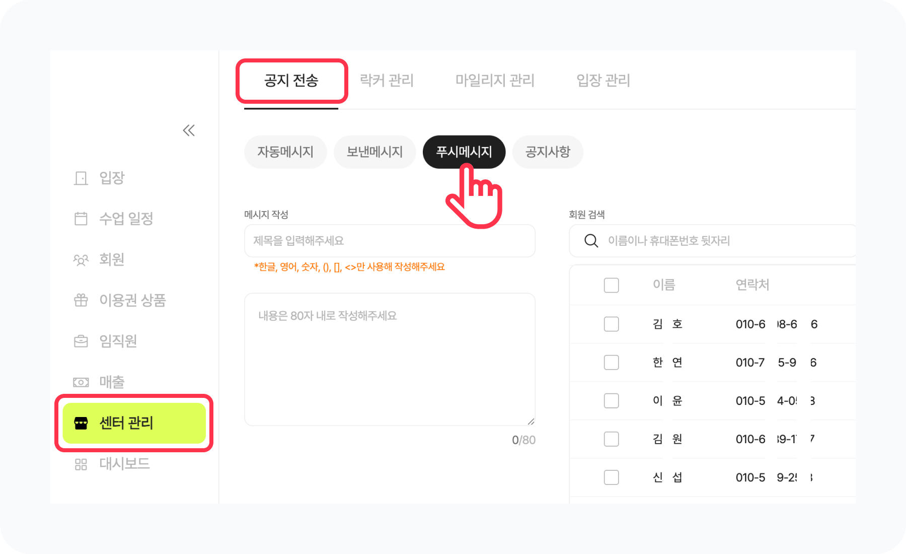 [센터 관리] 메뉴의 공지 전송 탭에서 푸시 메시지 버튼은 선택해주세요.
