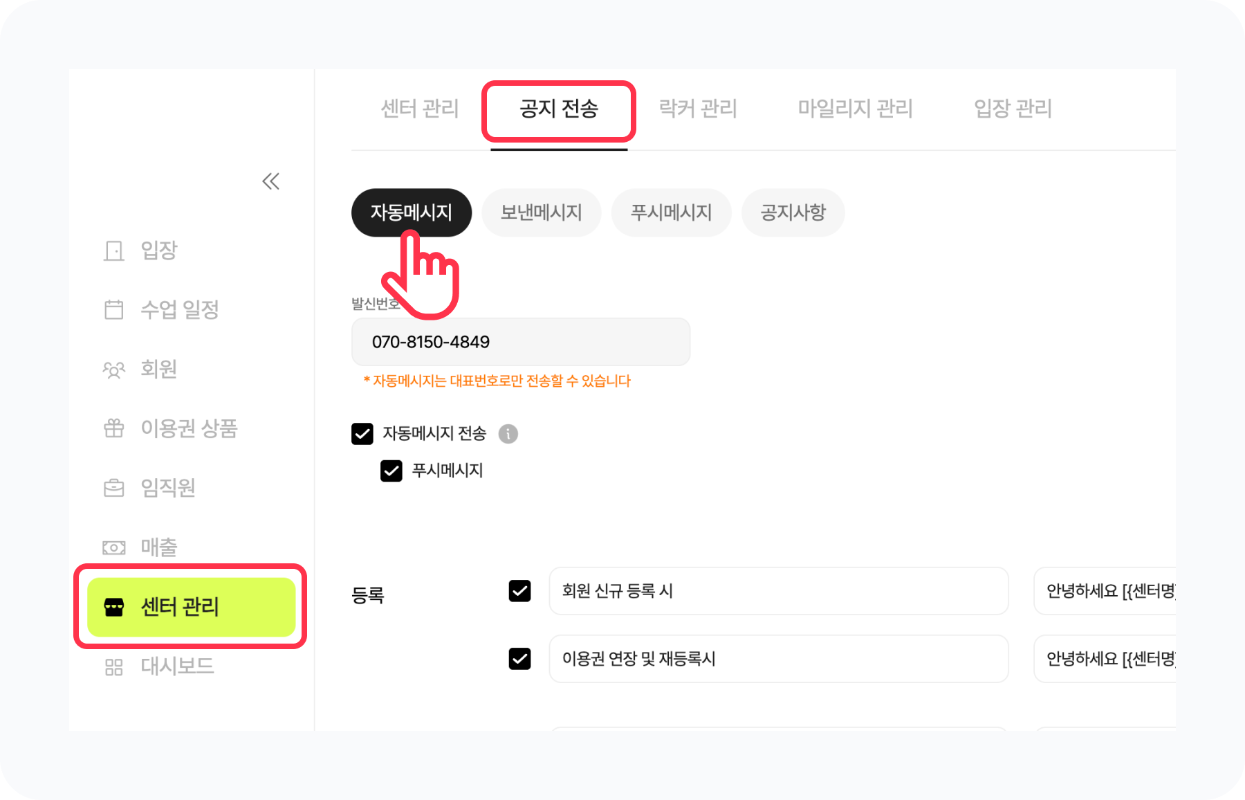 [센터 관리] 메뉴의 공지전송 에서 자동메시지 버튼을 눌러 회원에게 자동으로 전송되는 메시지를 설정할 수 있어요.