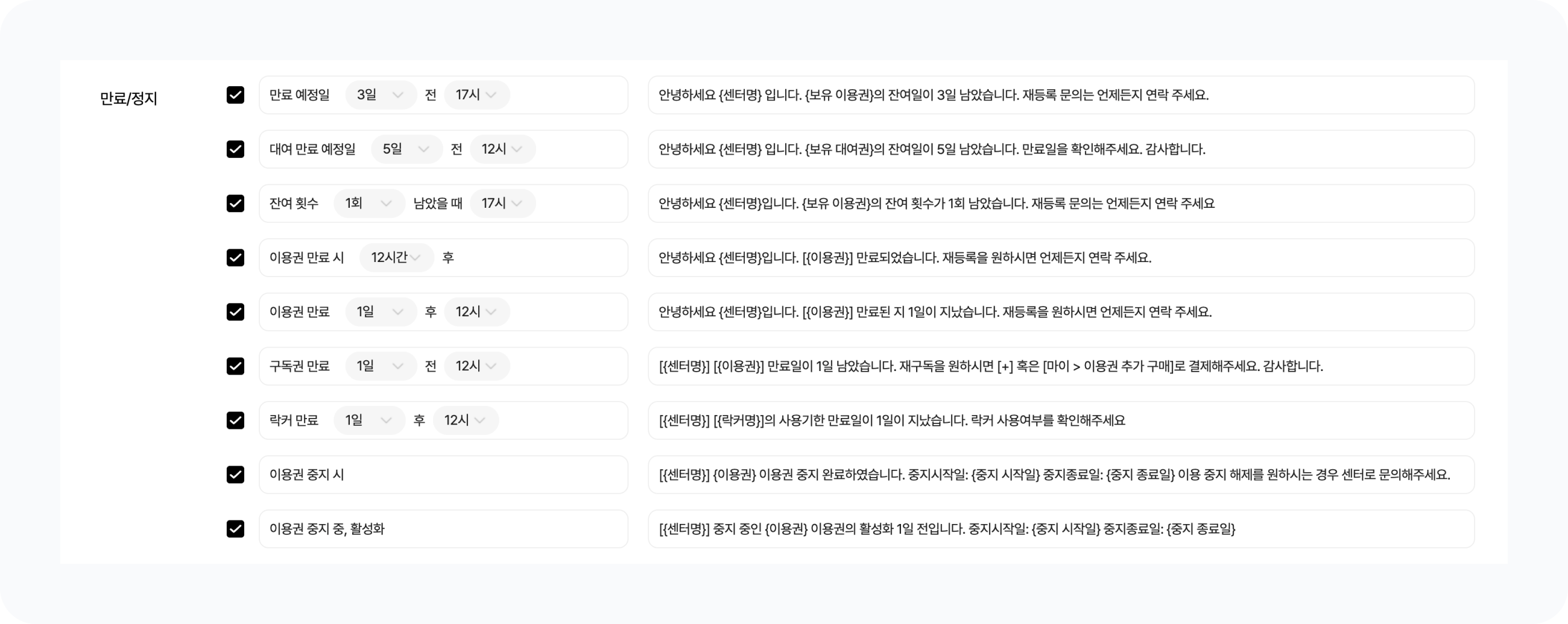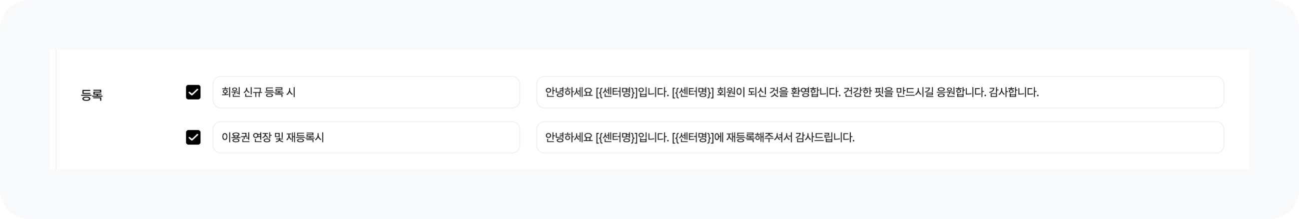 등록 : 회원 신규 등록, 이용권 연장 또는 이용권 재등록 시 알림 메시지가 전송됩니다.