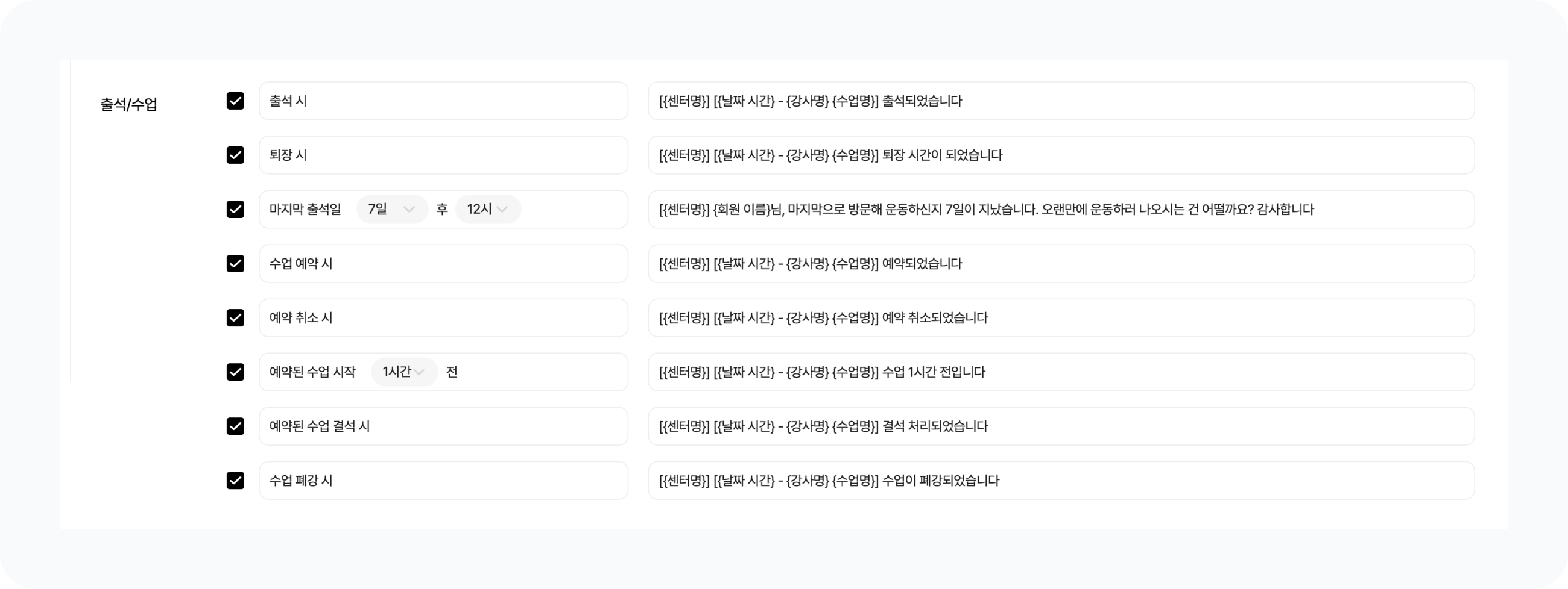 출석 / 수업 : 출석 시, 퇴장시, 마지막 출석 후 일정 기간 후, 수업 예약/취소/폐강/결석 시, 예약된 수업 시작 전 안내 메시지가 전송됩니다.